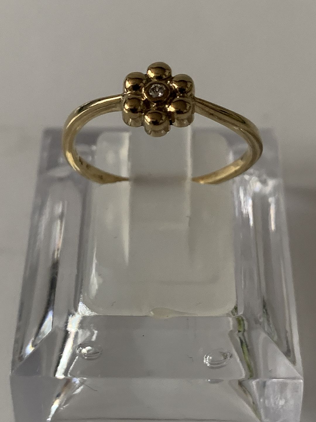 Description: Beautiful gold ring in a simple design, but with a flower on top. In the center of the flower is a small white stone that gives the ring a beautiful feminine look. The ring can easily be used as everyday jewellery, where it can be combined with other rings.
