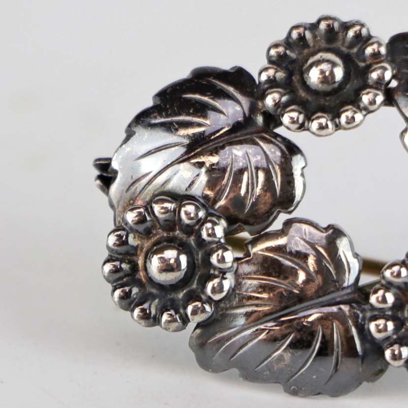 Beskrivelse: Broche i sterling sølv med motiv af en krans af blomster og blade