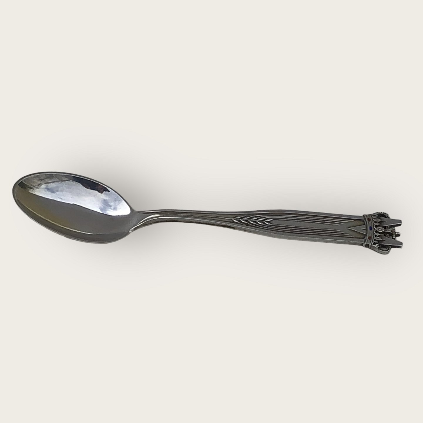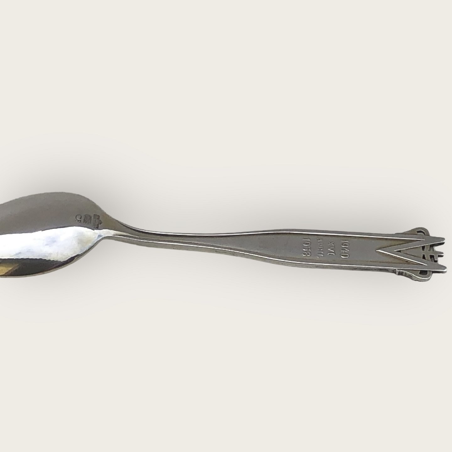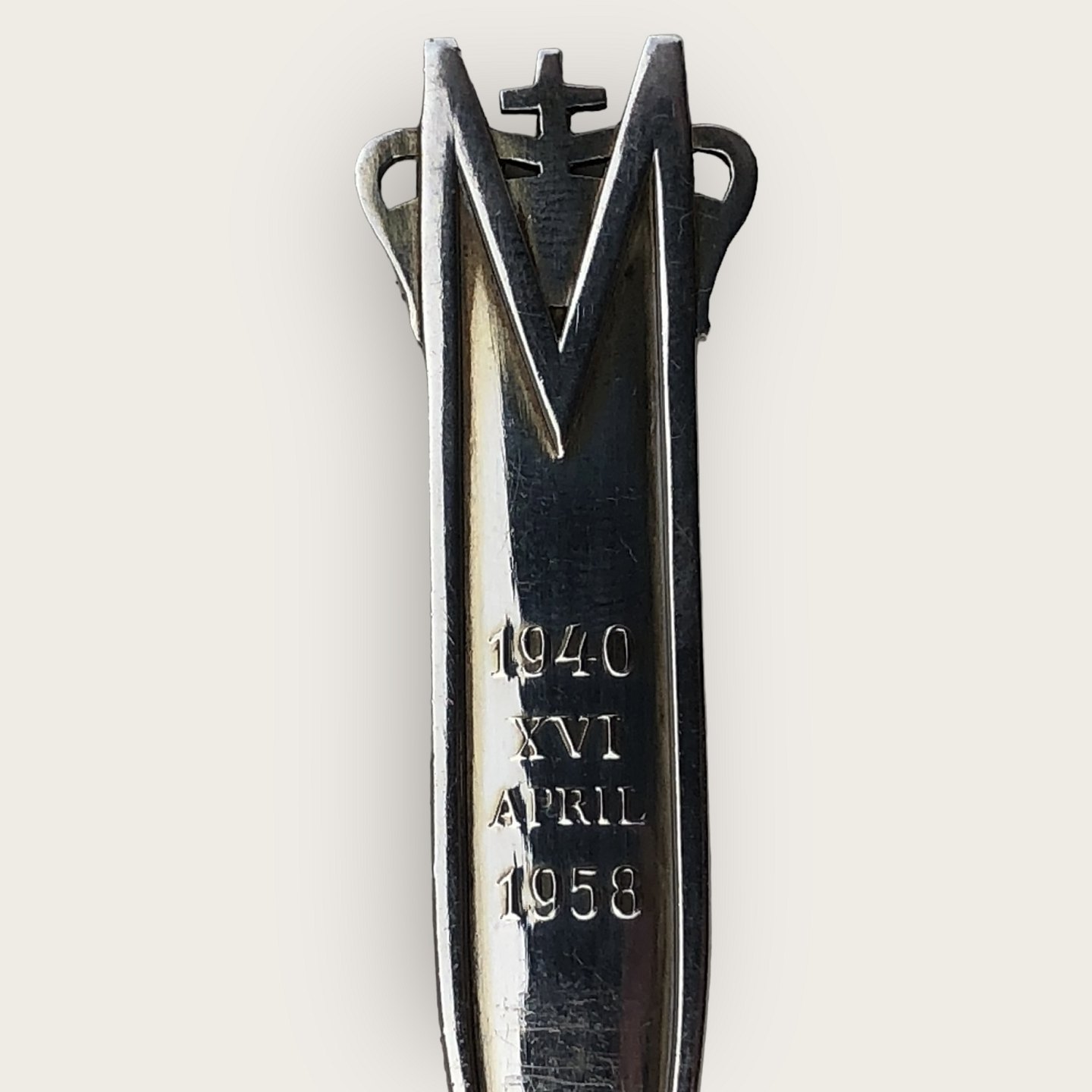 Beskrivelse: Anton Michelsen Sterling sølvske til fejring af daværende kronprinsesse Margrethes 18 års fødselsdag. 16,2 cm, pæn stand.
