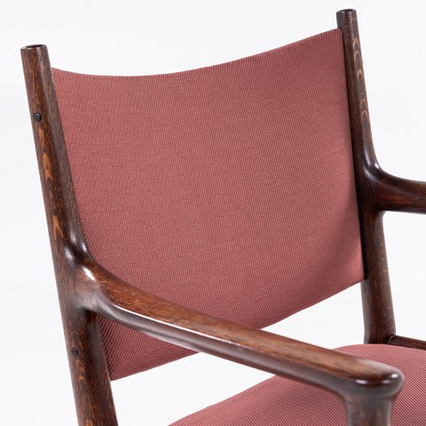 JH 713 - Armstol i mørkbejdset eg og originalt, rødt tekstil.