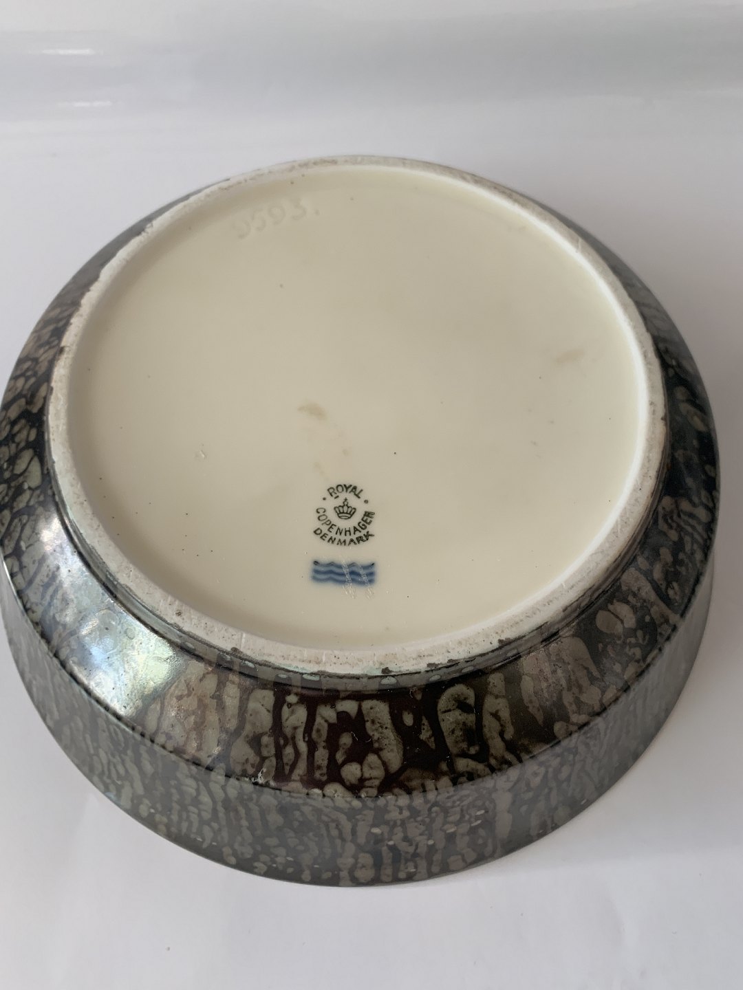 Beskrivelse: Flot porcelænsskål fra Royal Copenhagen med guldkant og flot motiv i bunden. Skålen er malet i tidløst mønster og farver, der gør at skålen kan bruges til nærmest alle formål. Det er en skål der kan stå fremme som dekoration, eller bruges til opbevaring.