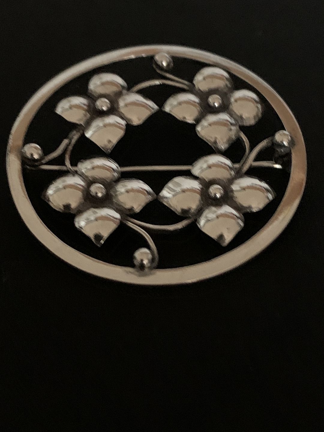 Smuk broche i sølv med flot mønster af blomster. Stemplet HJ 830s