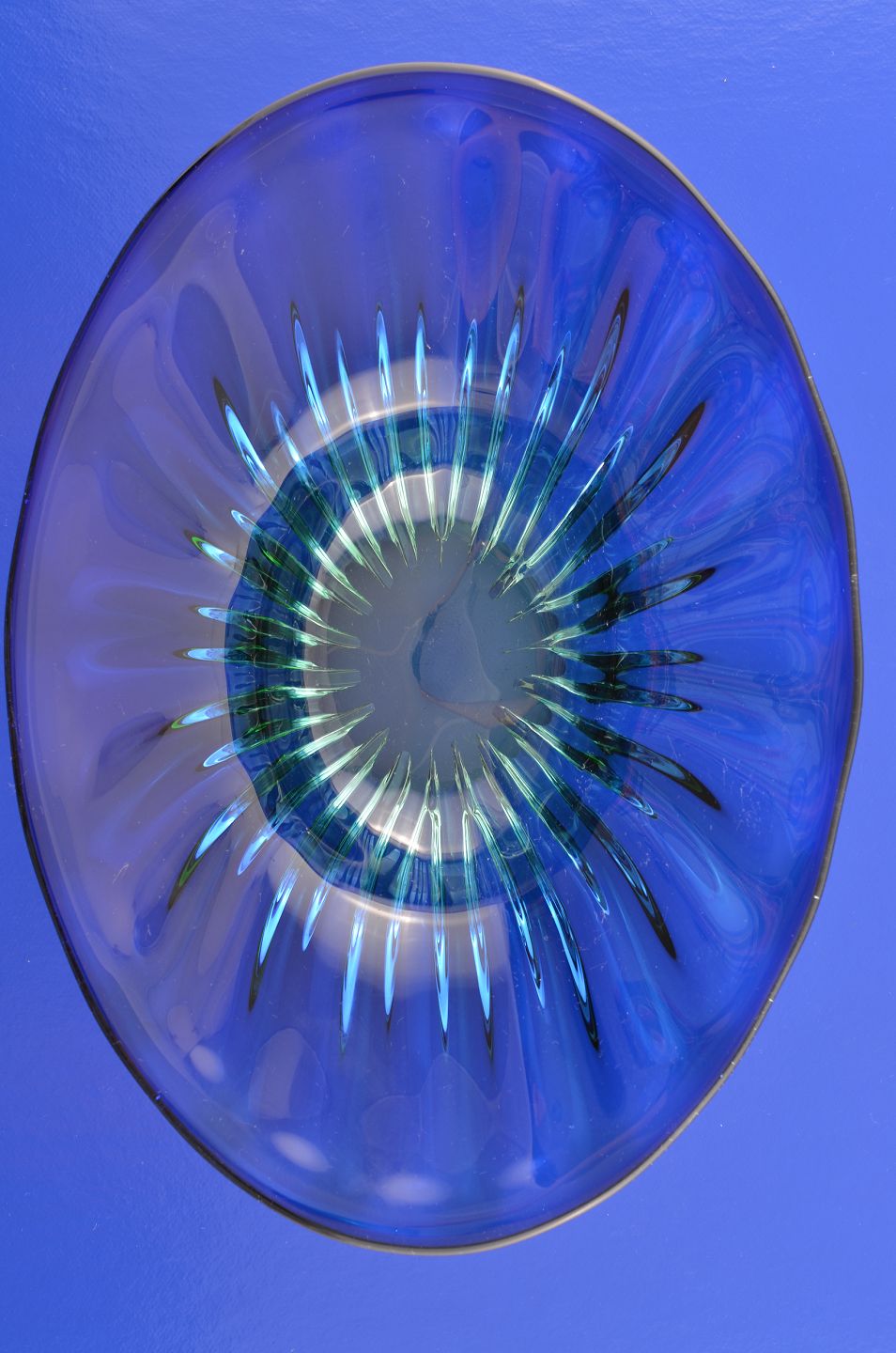 Description: Glass art from Italy 1960s. Large fruit dish of blue glass with a green base. 1960s. Length 37 X 27 cm. Fine condition.