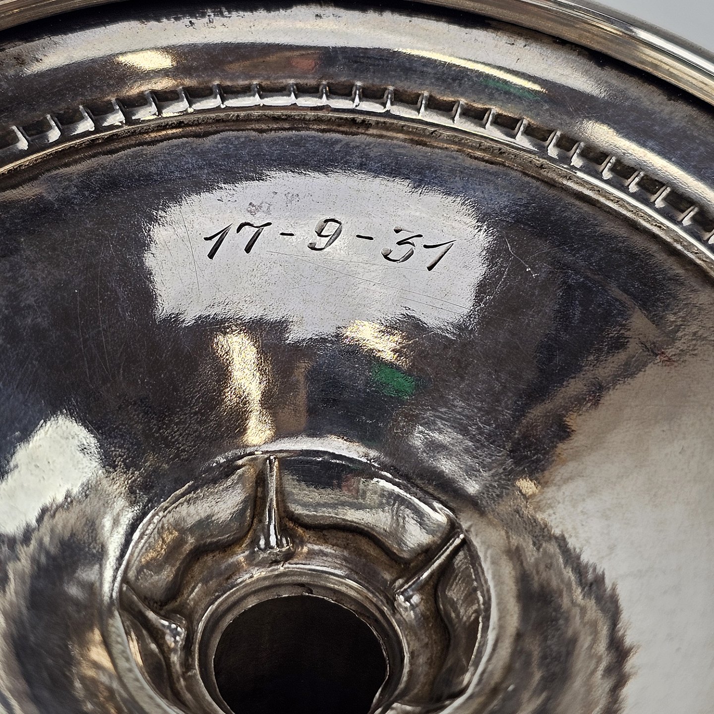 Beskrivelse: Håndlavet opsats i tretårnet sølv med inskription 17-9-31