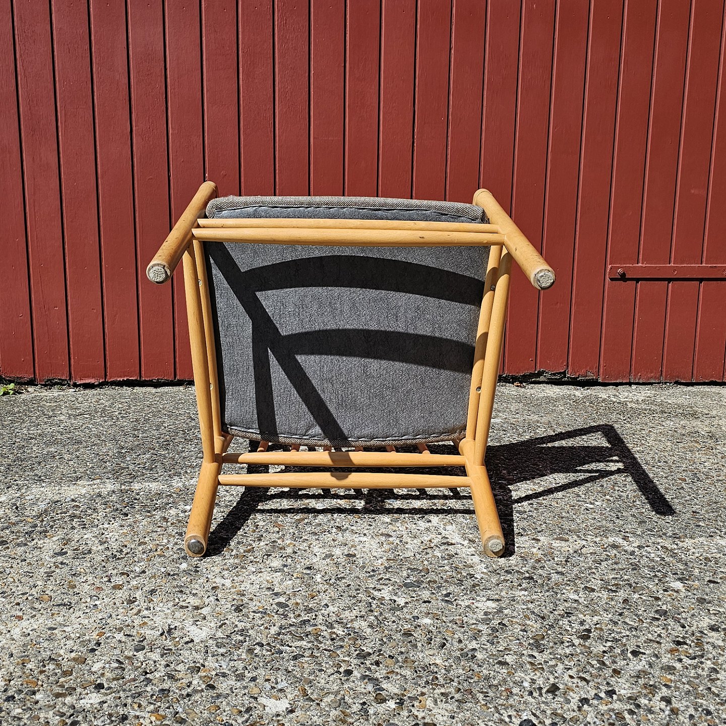 Beskrivelse: Stol med stel af bøgetræ. Sæde og ryglæn betrukket med lys gråt stof. Ryghynden er aftagelig. Model nr. J147