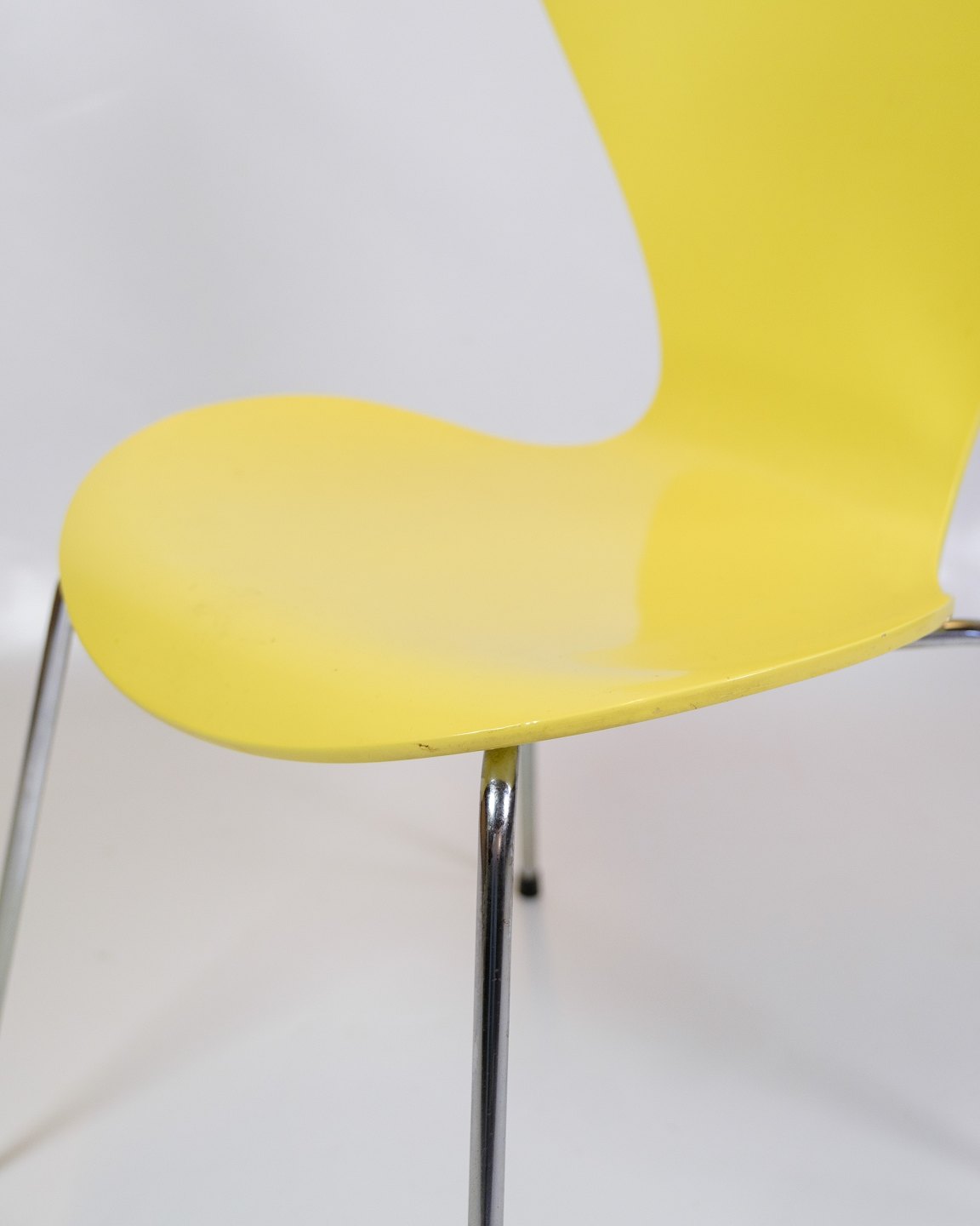 Description: Set of 6 dining chairs, model 3107, also known as the "Seven chair", designed by Arne Jacobsen and produced by Fritz Hansen in the 1990s. The chairs are lacquered in a yellow colour, which gives them an elegant and timeless look. The Syver chair is known for its comfortable and iconic shape, which combines functionality with a stylish design.