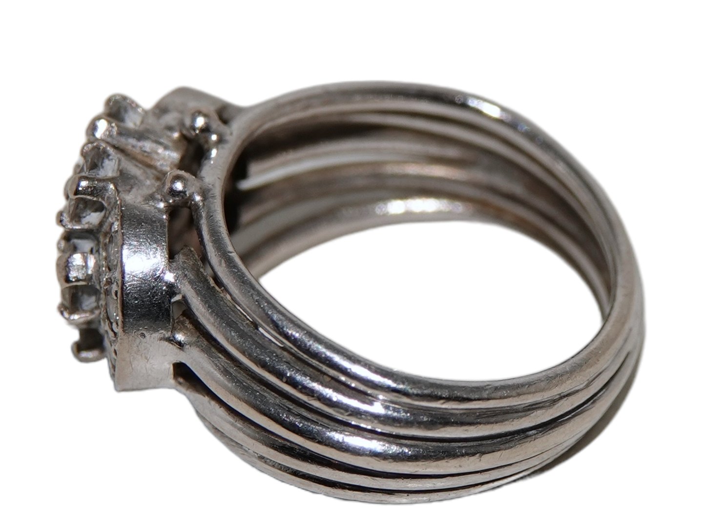 Description: 14 carat white gold ring with seven (7) large and many small diamonds.
