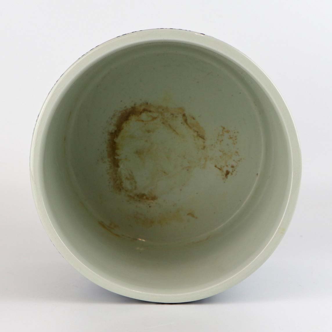 Beskrivelse: Urtepotteskjuler i porcelæn med motiv i blå streg af kvinde med fugl på hånd med titlen Foraar. Nr. 3024-699