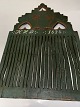 Beskrivelse: Håndlavet i træ: Grønt bemalet vævespjæld fra 1834 med dekorationer. Mindre revne nederst på vævespjældet. Krampe bortkommet. 30 cm B. 19 cm