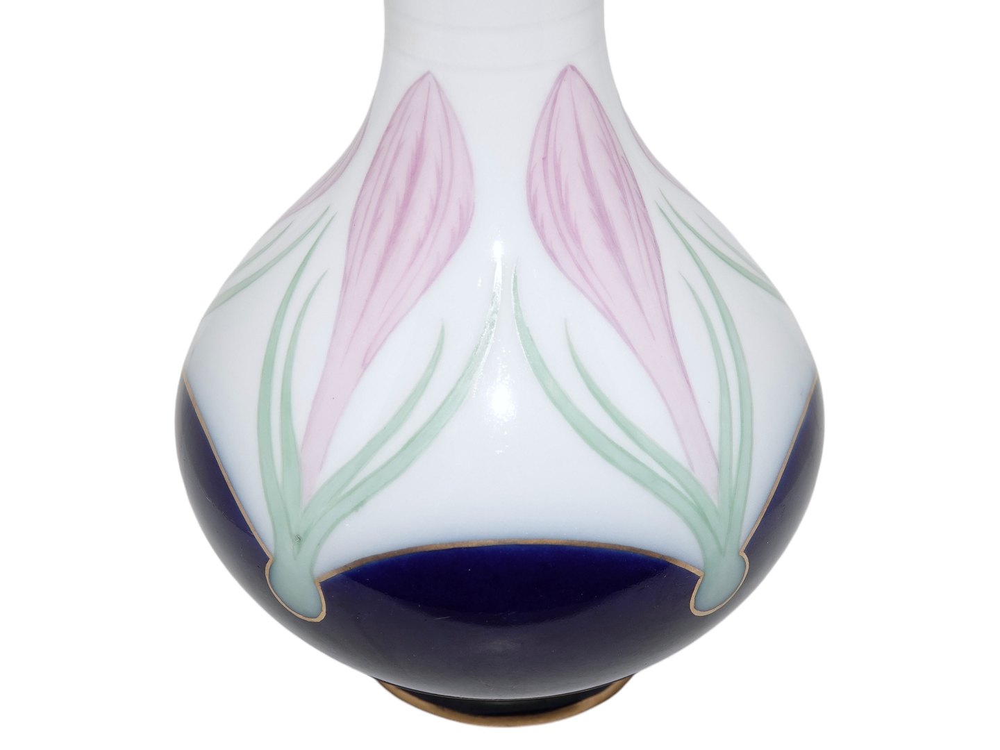 Description: Antique Bing & Grondahl Art Nouveau vase with pink flowers and gold edge.