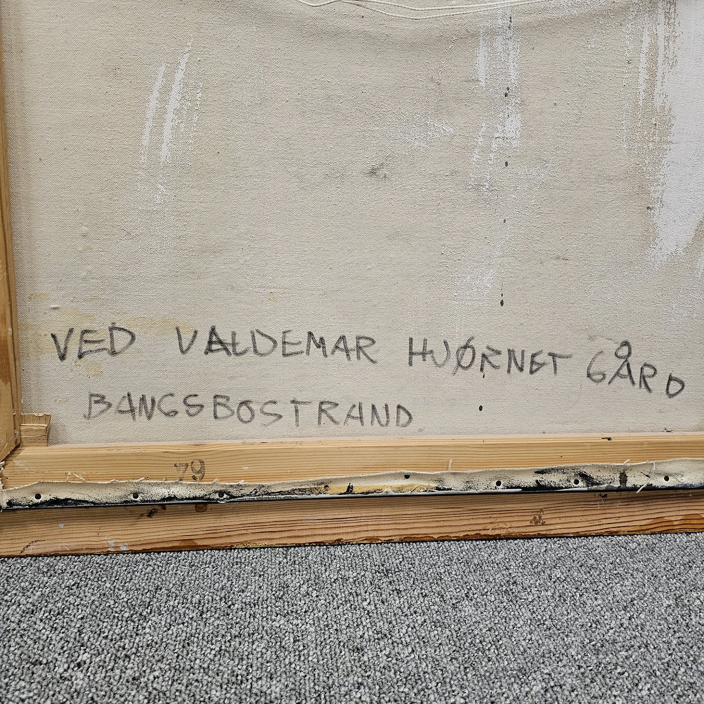 Beskrivelse: Maleri af olie på lærred, med motiv af huse. Bag på ses teksten, Ved Valdemar Hjørnet gård, Bangsbostrand