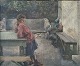 Maleri af Eilar Sørensen: Pige med fletninger i haven