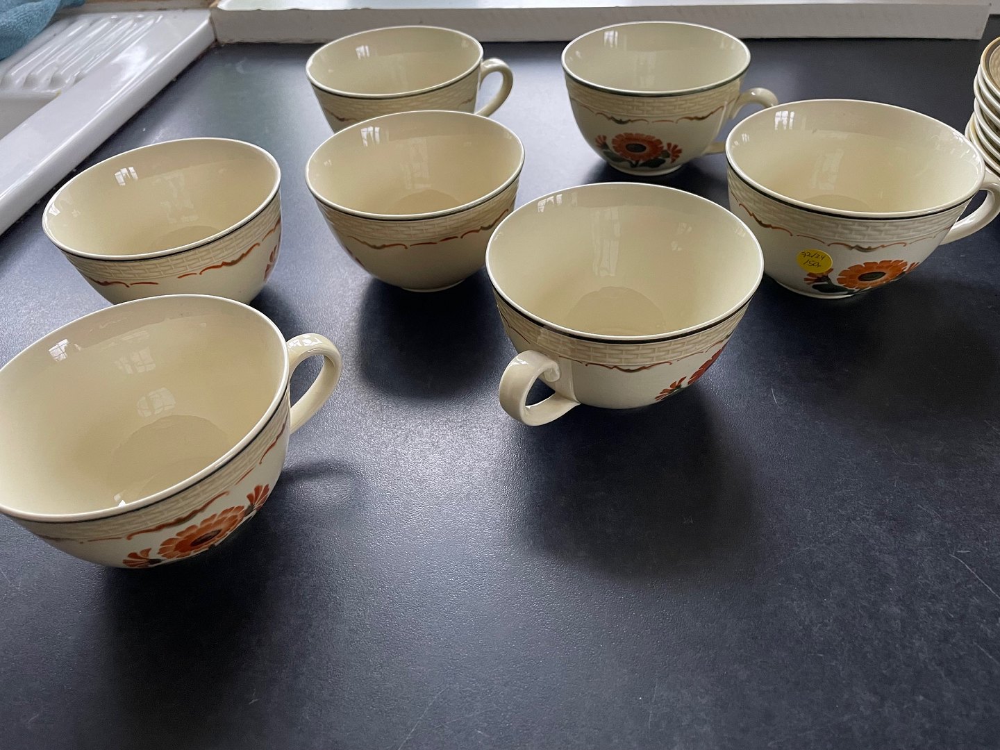 Beskrivelse: Aluminia, Morgenfrue. Designet af Niels Thorsson. Produceret i perioden 1934-1967. Luftmalet. Tekop. Nr. 1782. Højde 5,5 cm. Diameter 9,5 cm. Underkop diameter 15 cm. Flot stand. Pris: 150 kr. stk. Lager: 7