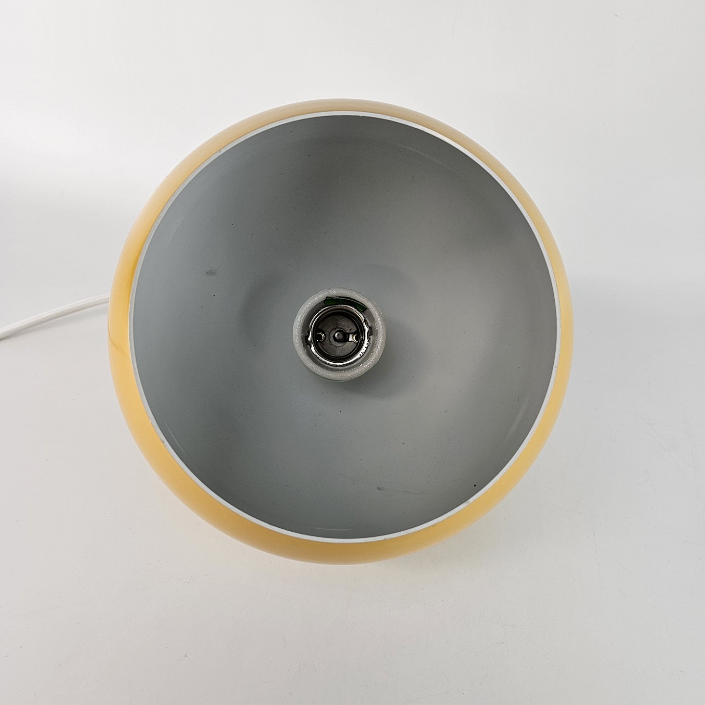 Beskrivelse: Kugleformet pendel med gul lakering og hvid inderside.