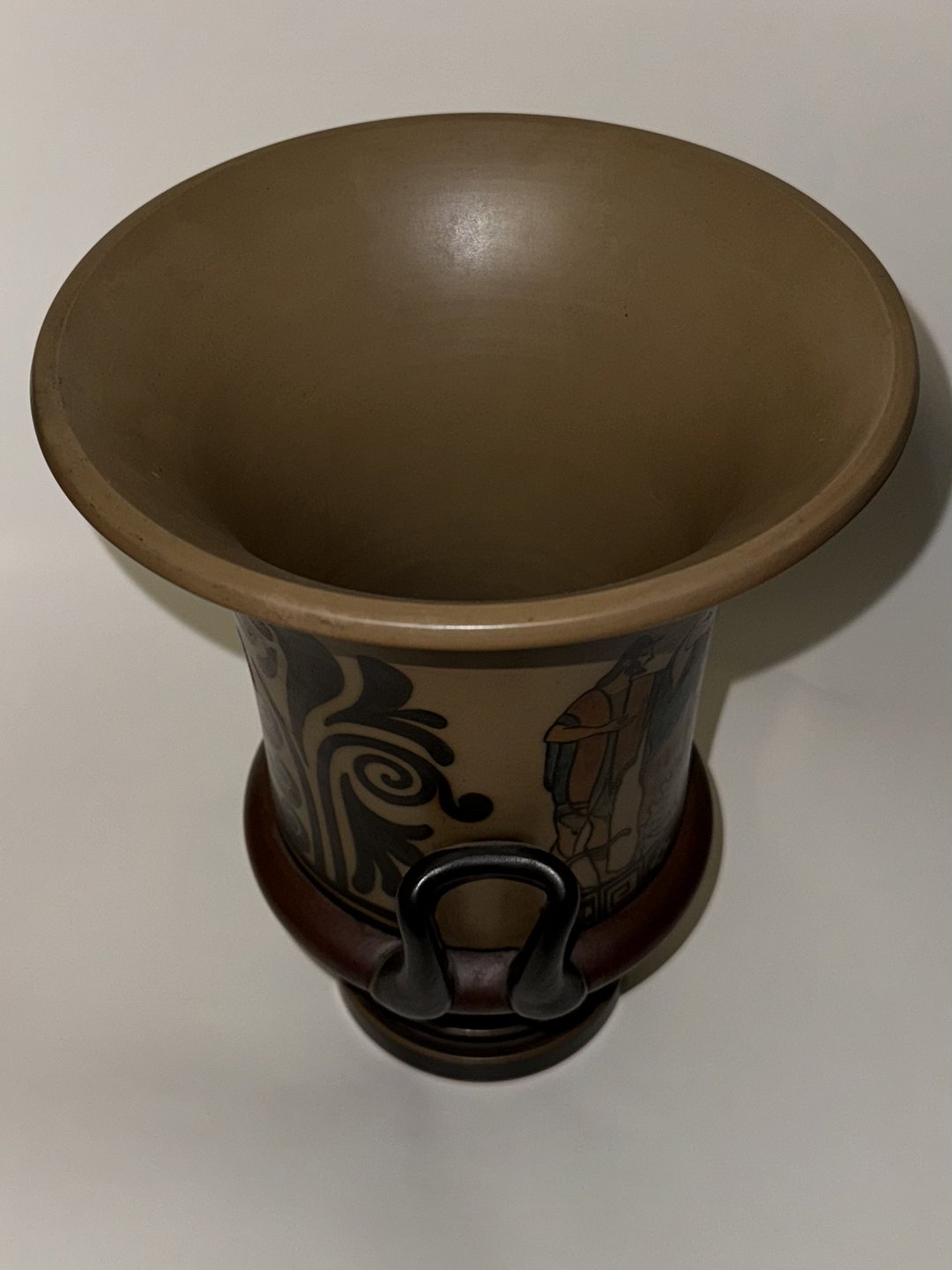 Description: Ceramic vase from Lauritz Hjorth. Produced at the beginning of the 20th century at the Bornholm ceramics factory in Rønne. in Greek shape with decoration of a group of figures around the vase. Also decorated with two handles. Appears in good condition. The factory mark on the bottom. Dimensions: H. 24 cm and opening diameter of 19 cm