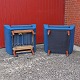 Beskrivelse: Et sæt lænestole med ben i lakeret teaktræ. Stolene er betrukket med blåt uldstof.