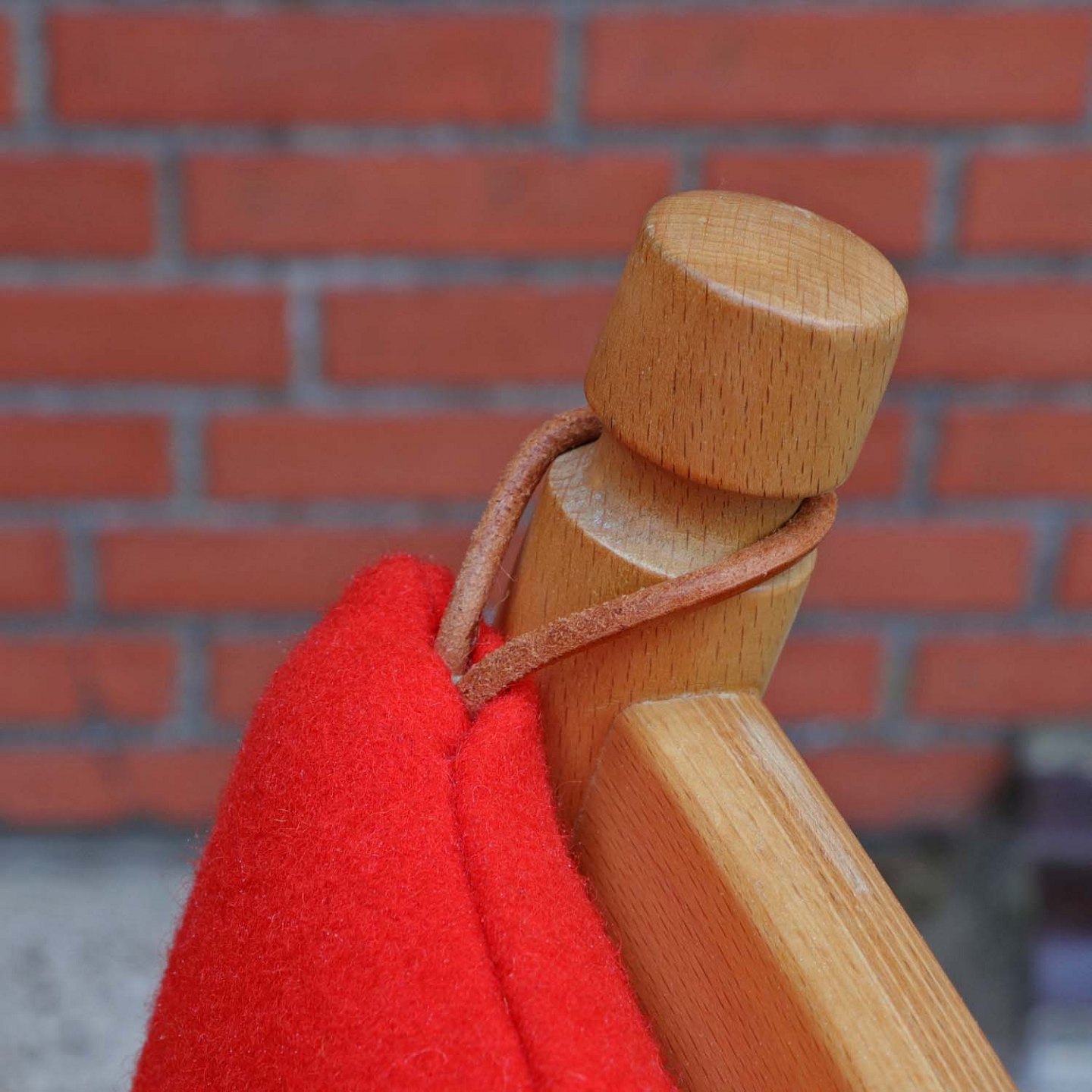 Beskrivelse: Et sæt med to tremmestole med armlæn og stel i lakeret lyst bøg samt hynder betrukket med orangerødt uldfilt med læderstropper