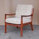 Beskrivelse: Lænestol med stel i lakeret teaktræ og springhynder betrukket med lys beige meleret uldstof. Model Senator