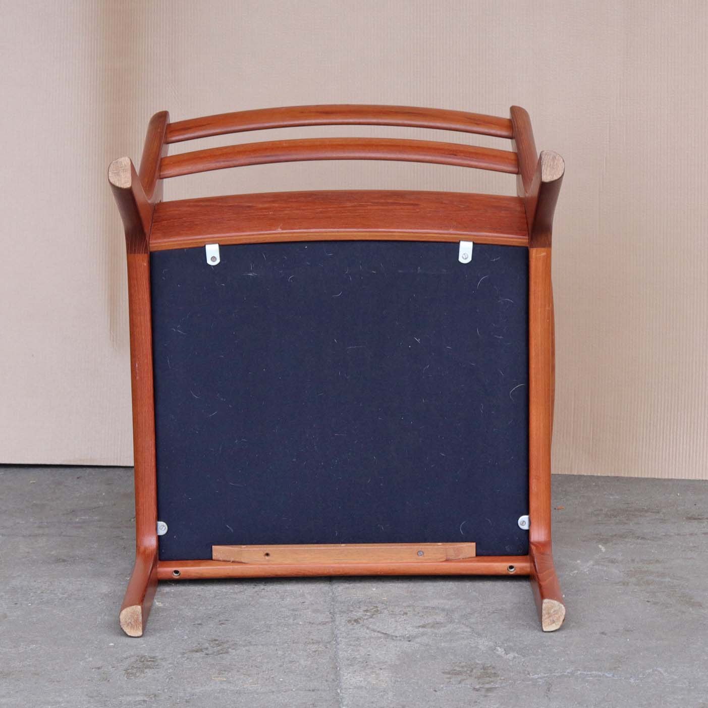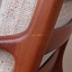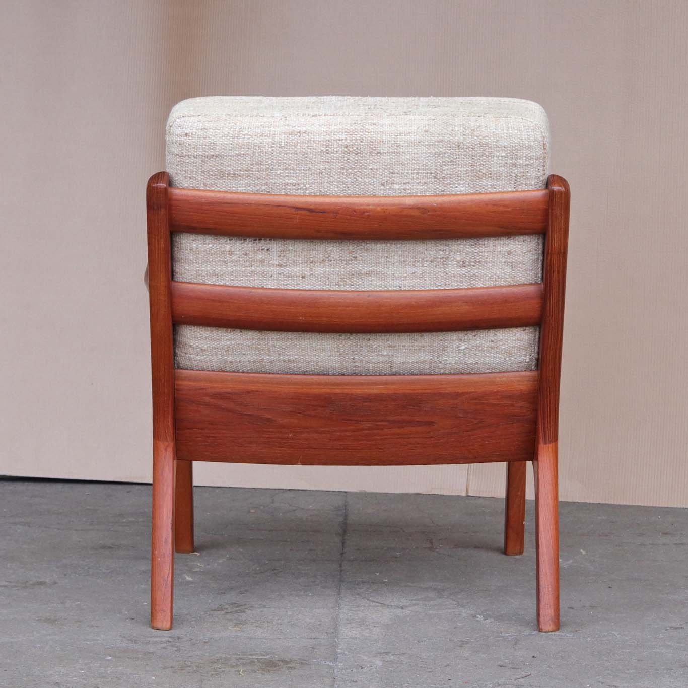 Beskrivelse: Lænestol med stel i lakeret teaktræ og hynder betrukket med lys beige meleret uldstof. Model Senator
