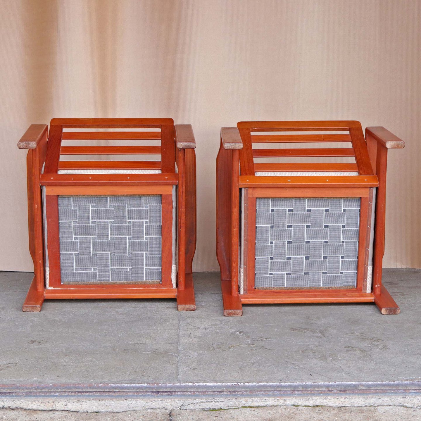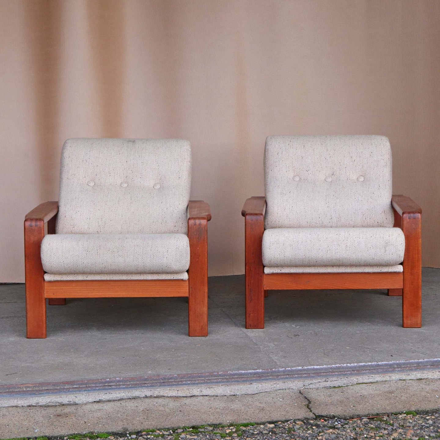 Beskrivelse: Et sæt lænestole med stel i lakeret teaktræ og hynder betrukket med lyst uldstof.