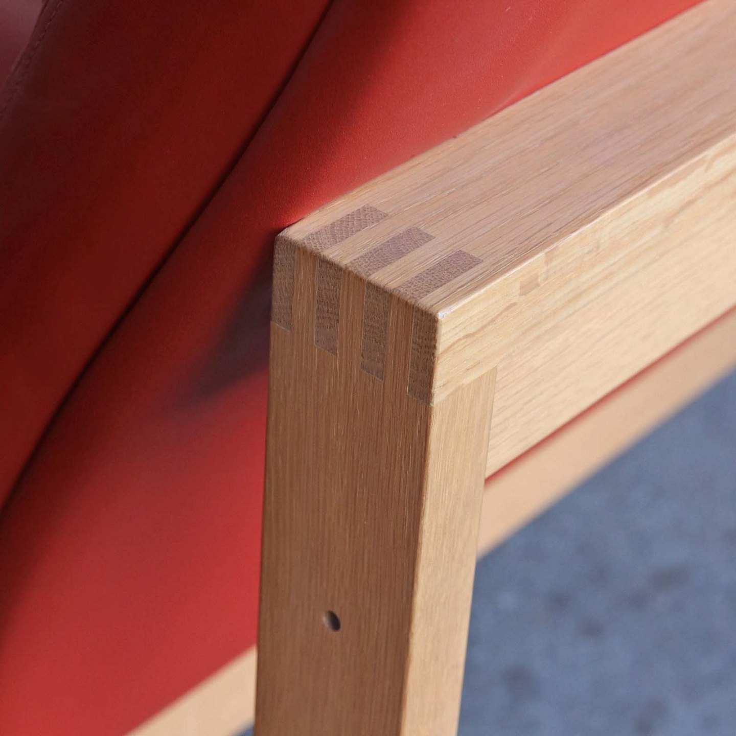 Beskrivelse: Et sæt lænestole med stel i lakeret egetræ og hynder betrukket med orangerød læder