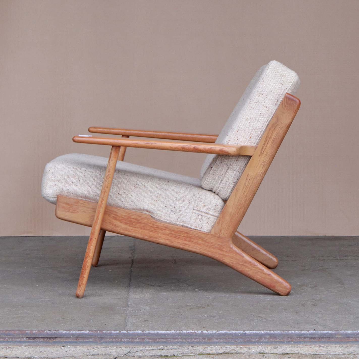 Beskrivelse: Lænestol med stel i lakeret lyst teaktræ og hynder med springfjeder. Hynderne er betrukket med meleret råhvidt uldstof. Model GE 290