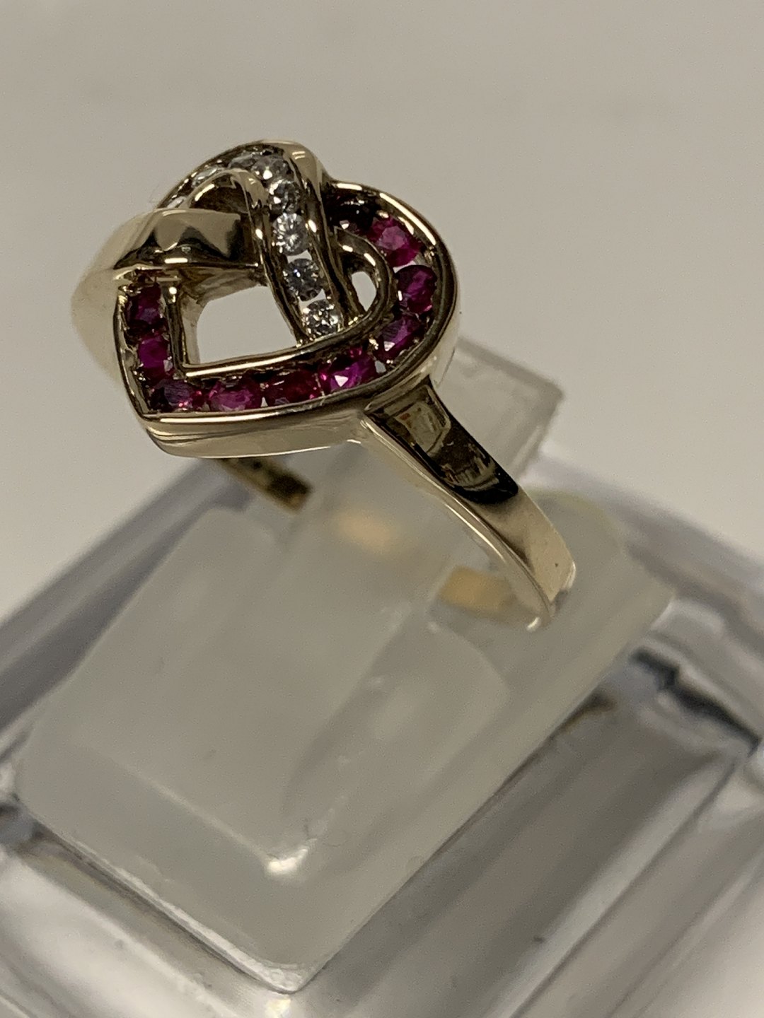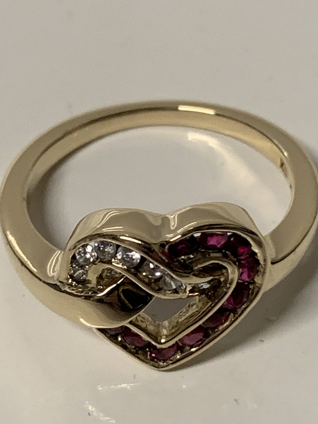 Description: Ladies' ring with red / clear stones in 9 carat gold.