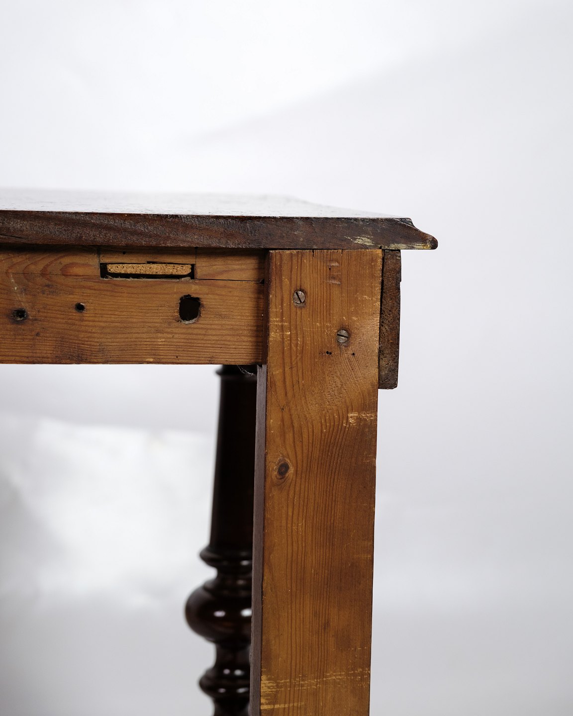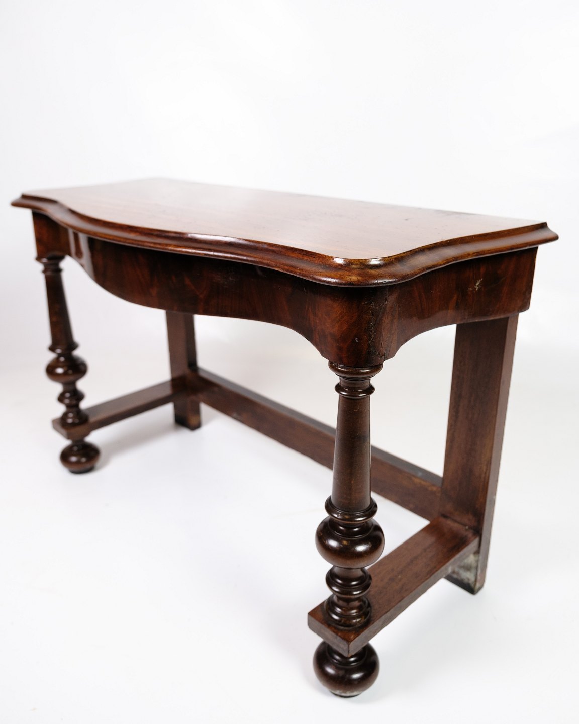 Beskrivelse: Konsolbord eller entremøbel fra 1920'erne, udført i mahogni med runde, elegant drejede ben. Bordets slanke design gør det ideelt som et funktionelt møbel i entréen eller som konsolbord i stuen. Mahogniens varme farve og fine åremønster afspejler perioden og håndværket, som er typisk for 1920'ernes møbelproduktion.