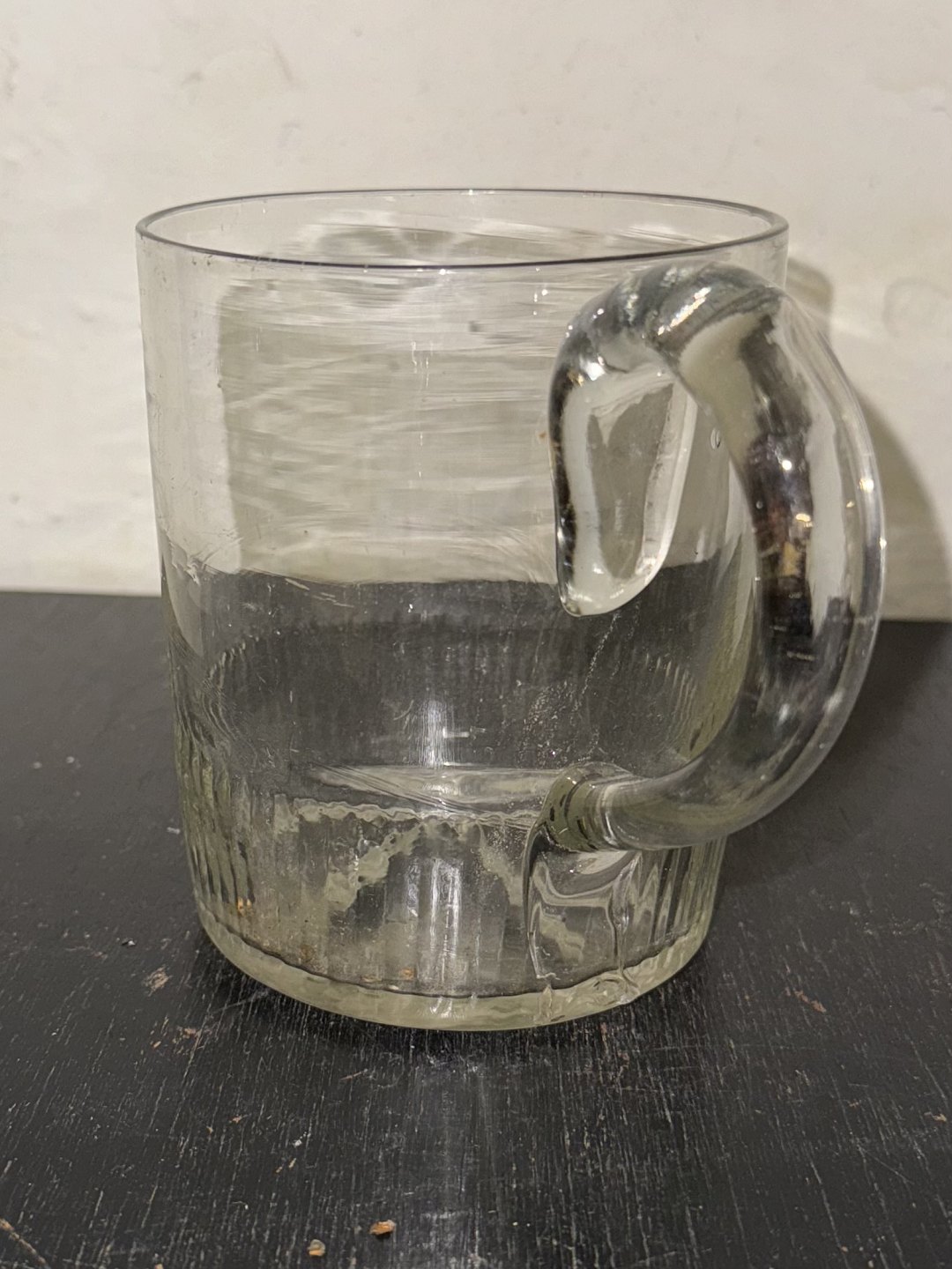 Description: Stort ølkrus i glas. Riflet bundparti og påsat hank. Tilskrives Holmegaard Glasværk fra midten af 19. århundrede. I god stand uden skader eller reparationer. Mål: H. 13,5 cm. Ø. 11,5 cm