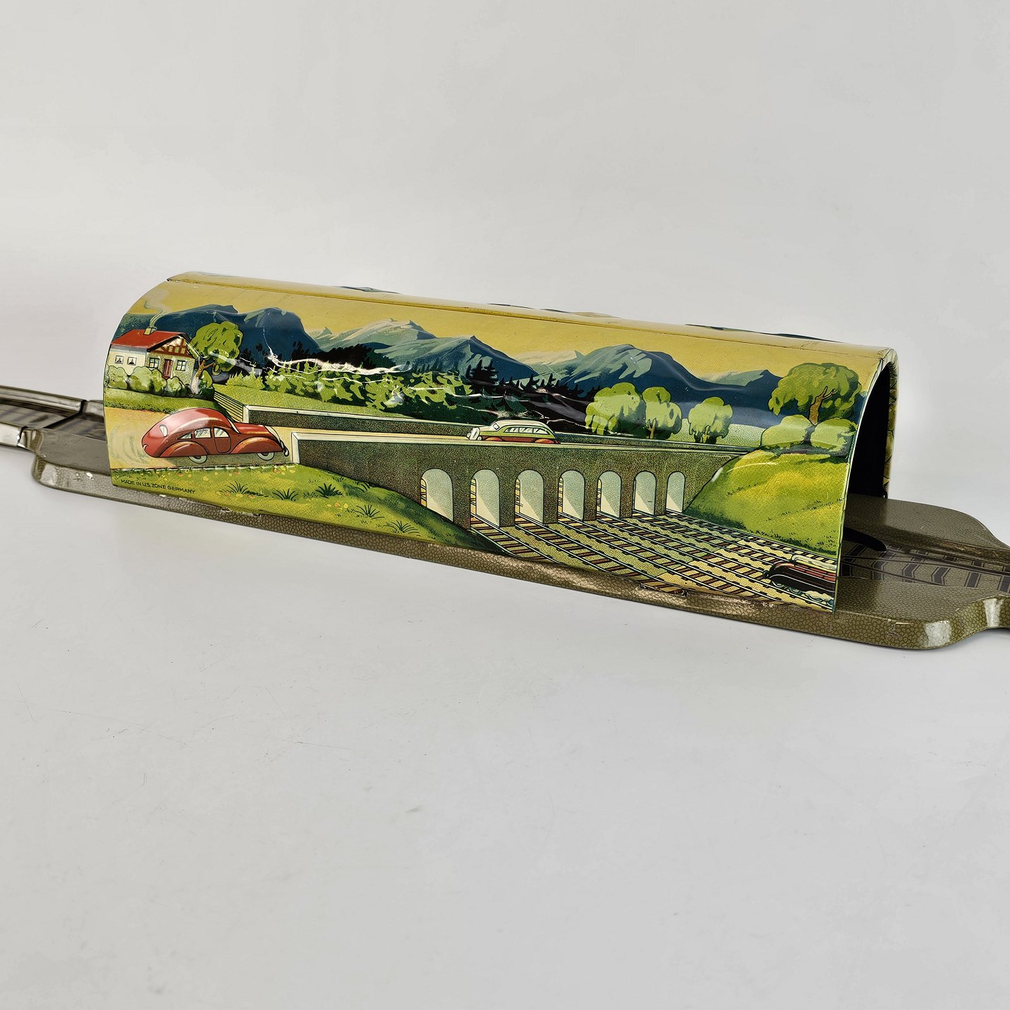 Beskrivelse: Togbane i blik, med to optrækkelige togvogne og tunnel med sjove motiver. Nøgle medfølger.