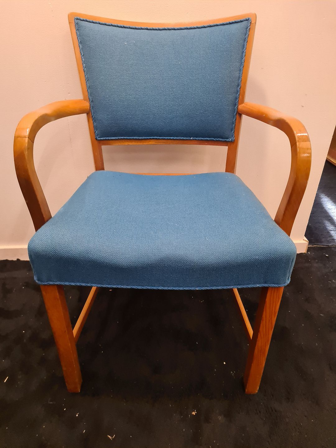 Beskrivelse: Dansk snedkermester armstol udført i lys lakeret Elm betrukket med uld stof.