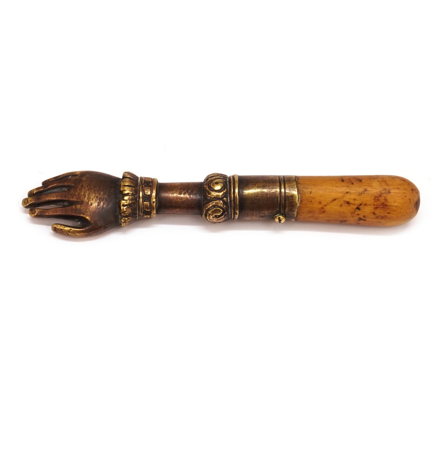 Dansk politihånd i messing med øjet i hånden og kronet træskaft. Danmark ca. år 1750. L: 15cm