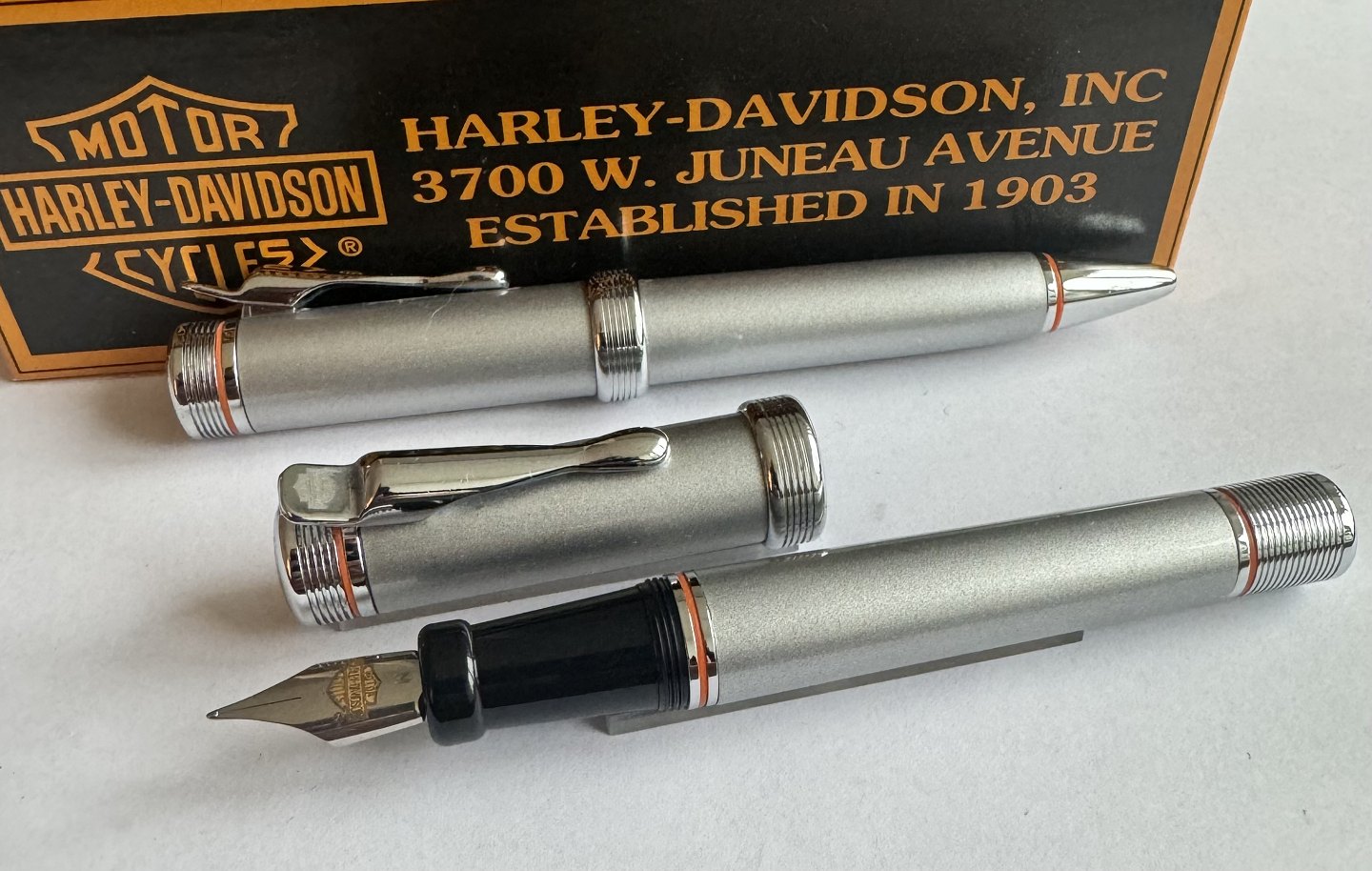 Metallic gray Harley Davidson fountain pen set with ballpoint pen in original box
