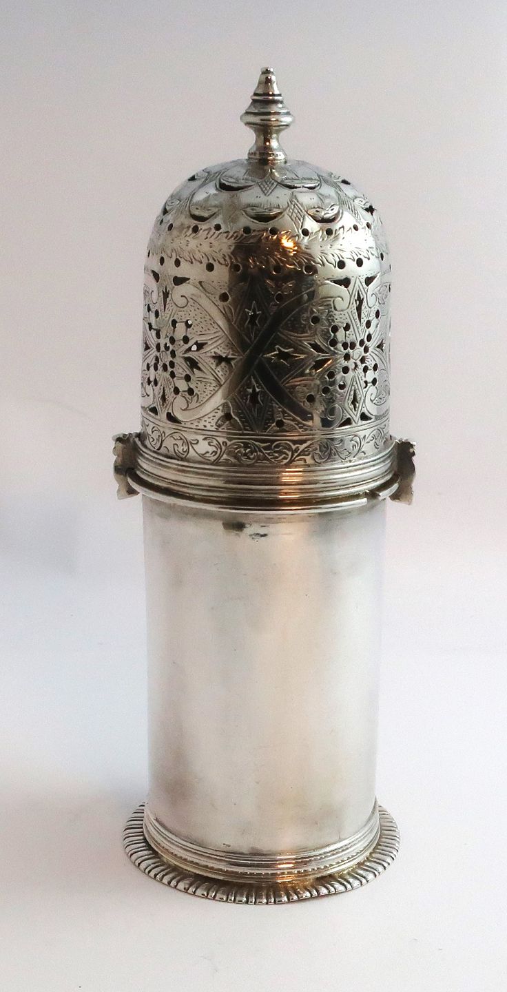 Mikkel Gregersen, Aarhus (1714-1729). Granatsukkerbøsse af sølv med cylinderformet korpus (830). Højde 18 cm.
