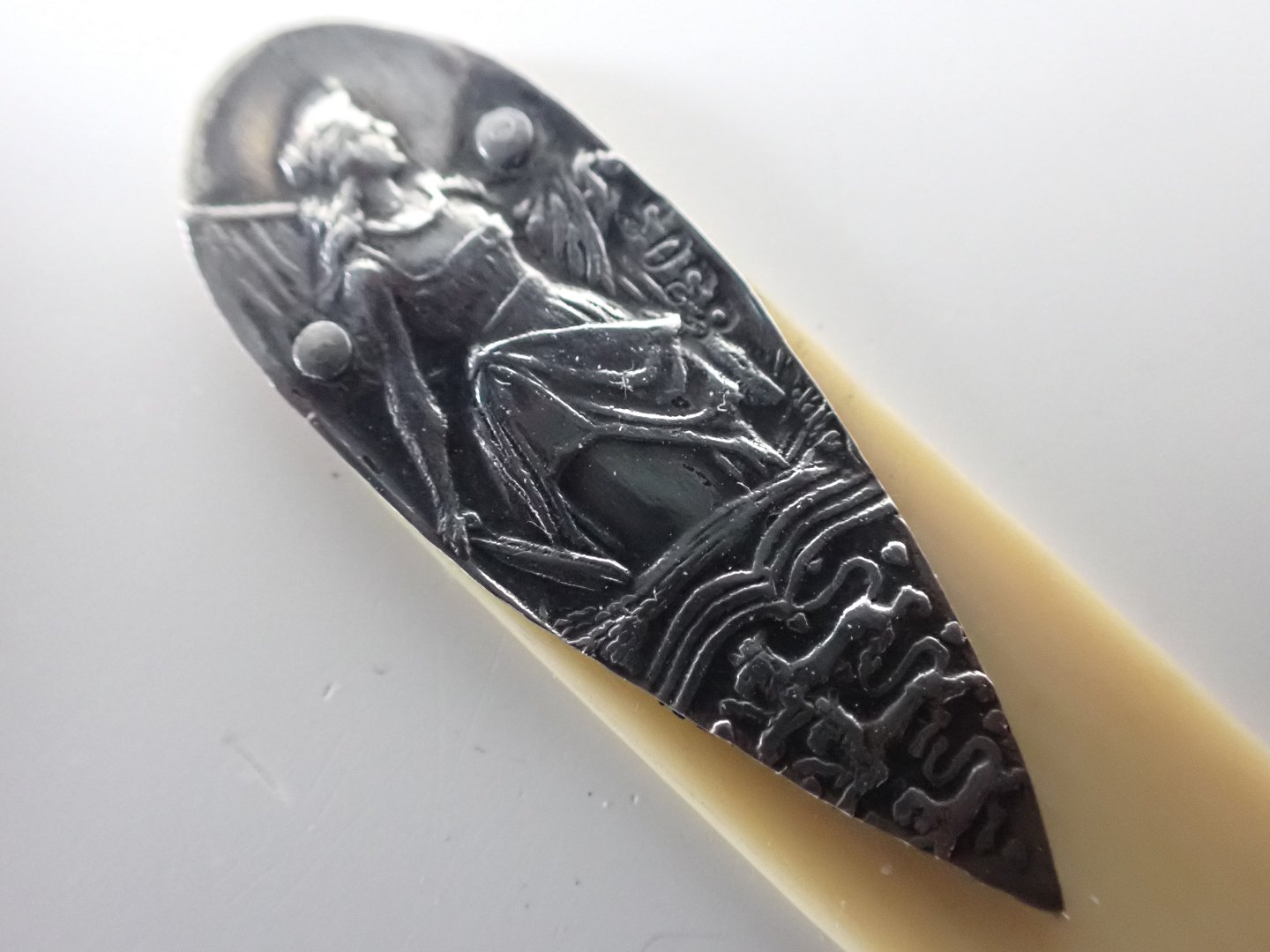 Bogmærke i 830 sølv og ben. Sølvstykket er presset med "Mor Danmark" og de tre løver hvilket tyder på at den er fremstillet efter krigen i 1864. Længde: 9,5 cm. I pæn stand. Pris : 150 kr.