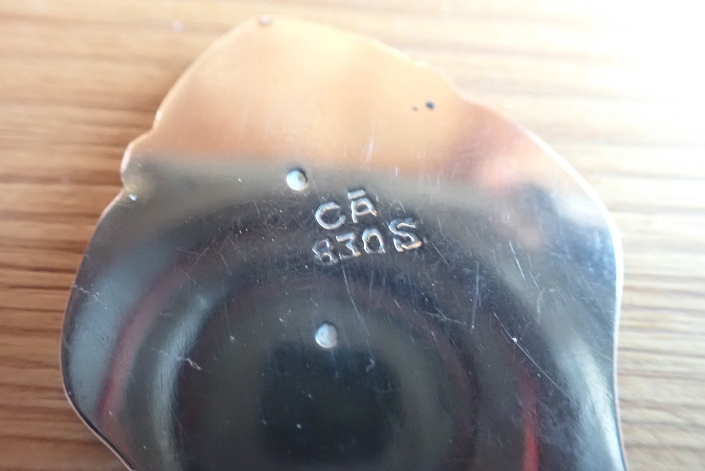 Bogmærke i 830 sølv med fransk lilje dekoration udført af C.F. Andreasen KBH. (1893 - 1937) - Hammerslået. Stemplet: 830s, C.A. Ca. 1930. Vægt: 5,7 gram. Længde: 8,4 cm. I pæn stand. Solgt.
