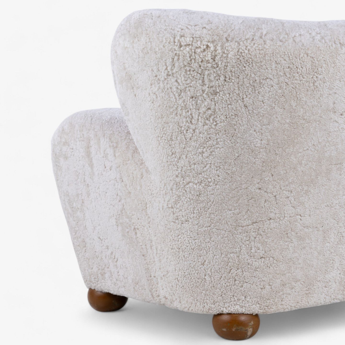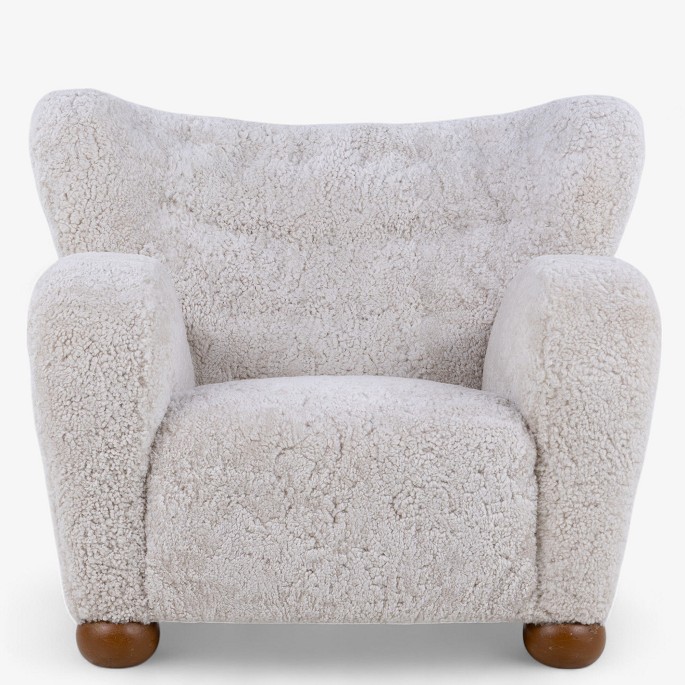 Sjælden 'Aulanko'-lænestol i nyt lammeskind (farve: Moonlight). Formgivet c. 1939 til Hotel Aulanko i Finland.
