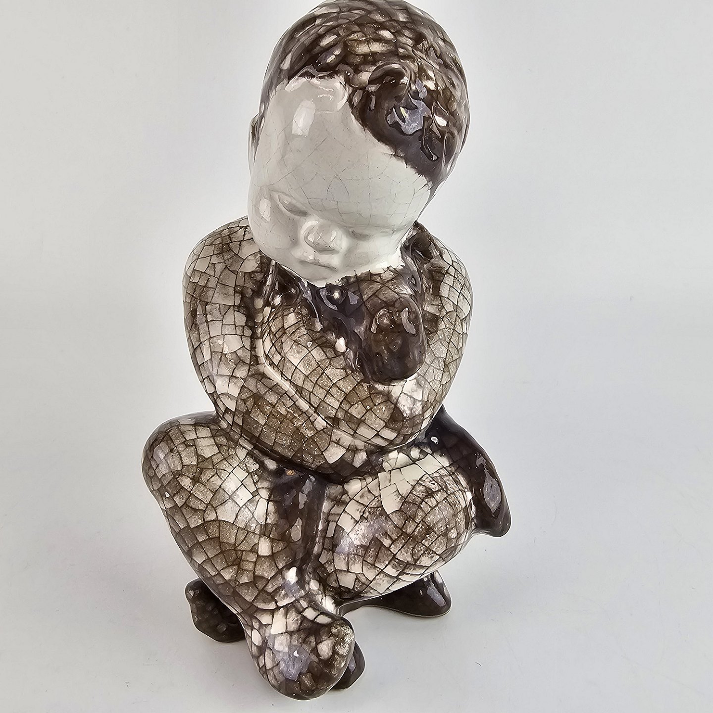 Beskrivelse: Figur med krakeleret udseende, med motiv af en lille dreng med en hundehvalp.