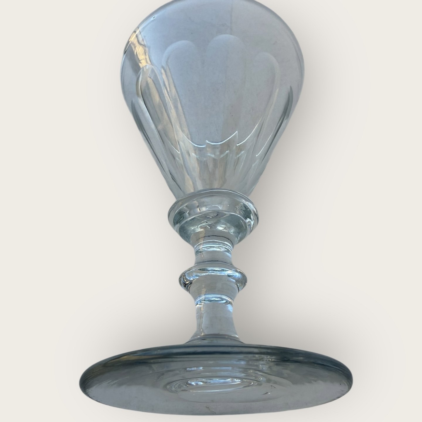 Beskrivelse: Anglais, facetslebet glas, kugleslebet i bunden, Højde 13,5cm, Diameter øverst 8,5cm, Diameter fod 7,2cm, Enkelte luftbobler.