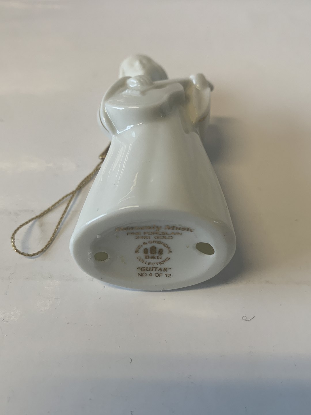 Beskrivelse: Bing & Grøndahl. Heavenly Music. Guitar No. 4 af 12. Hvid porcelæns engel med guld staffering og guldvinger (24 karat). Serien hedder " Engel med Instrumenter" og består af 12 stk.