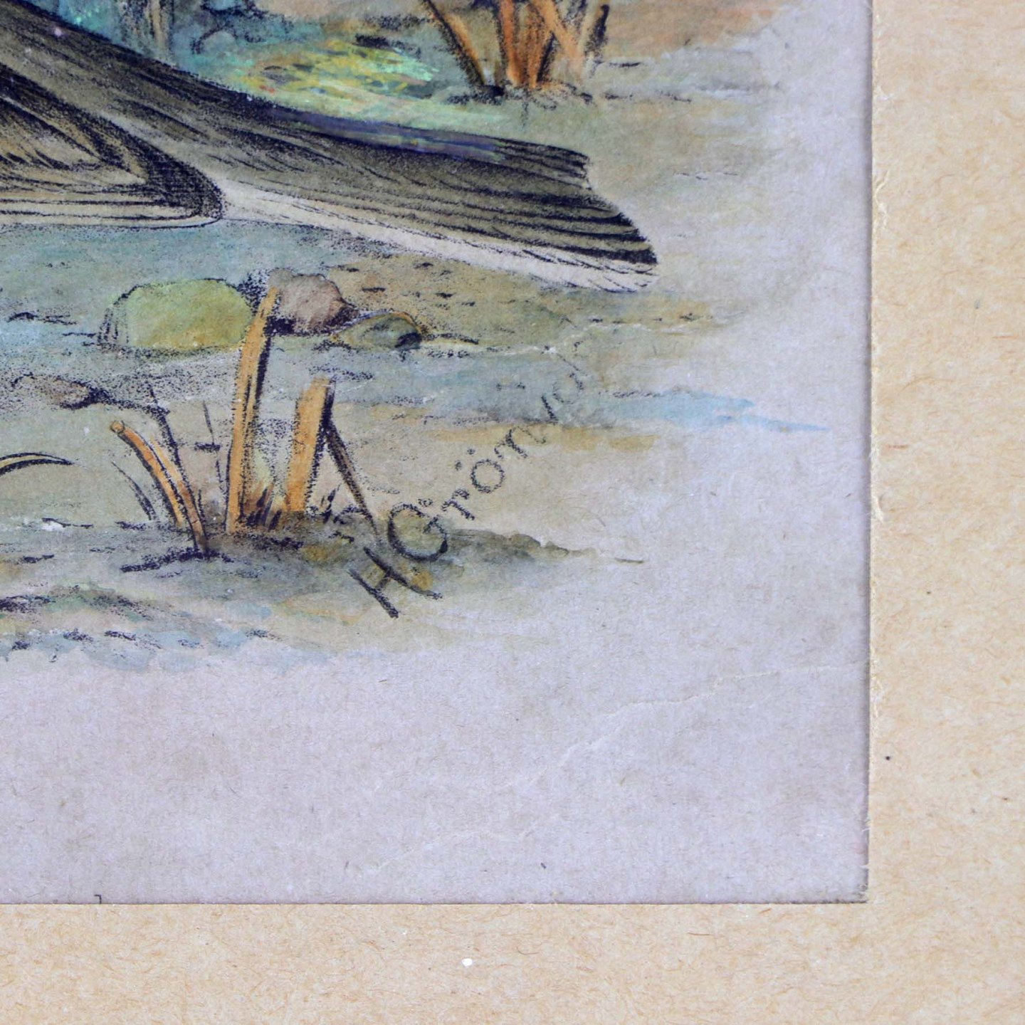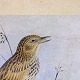 Beskrivelse: Indrammet ældre litografi med brunt passepartout i træramme og motiv af to fugle i vipstjerter og pibere familien.