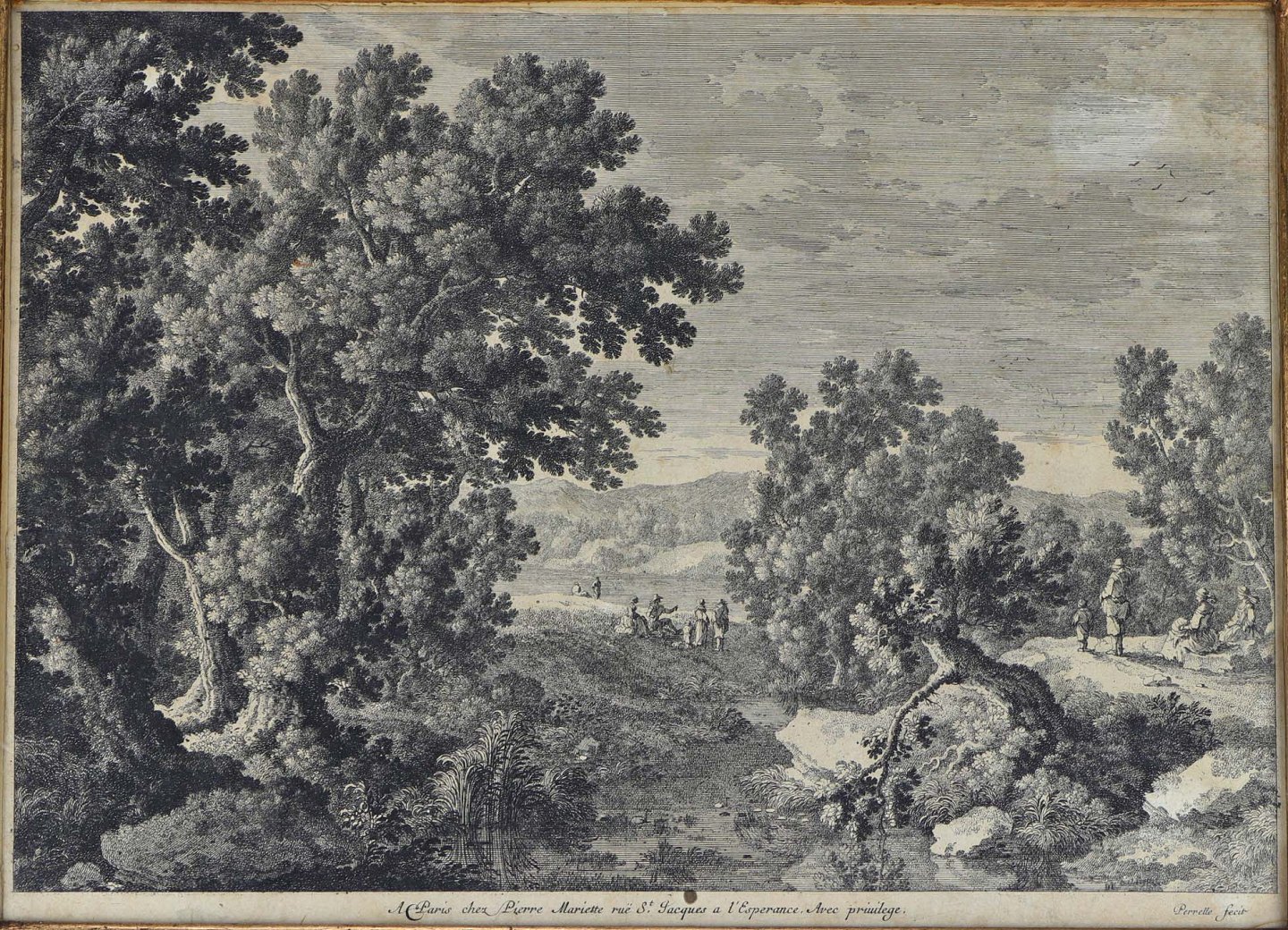 Beskrivelse: Indrammet bogtryk i guldmalet struktureret træramme med motiv af grupper af mennesker i landskabsområde.