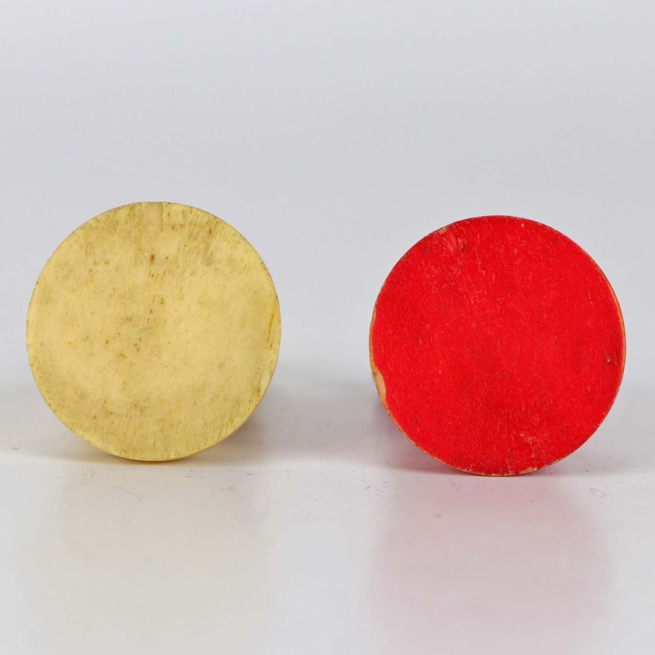 Beskrivelse: Ældre sæt røde og hvide skak brikker af ben. brikkerne kommer i ældre polstret cigaretboks. I alt 32 brikker.