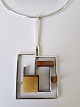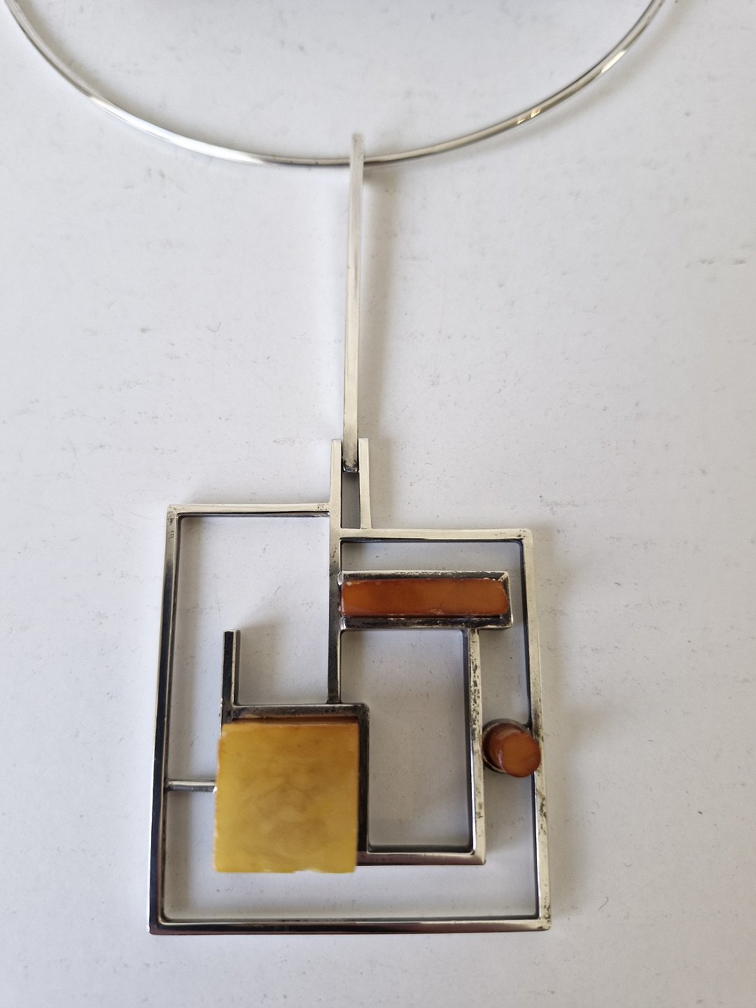 Beskrivelse: Bent Knudsen halsring i sterling sølv med grafik vedhæng prydet med rav