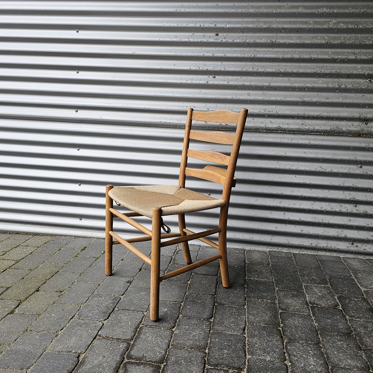 Beskrivelse: Sæt af fire styk Kirkestole af egetræ med flettet sæde og bagpå hænger en lille hylde