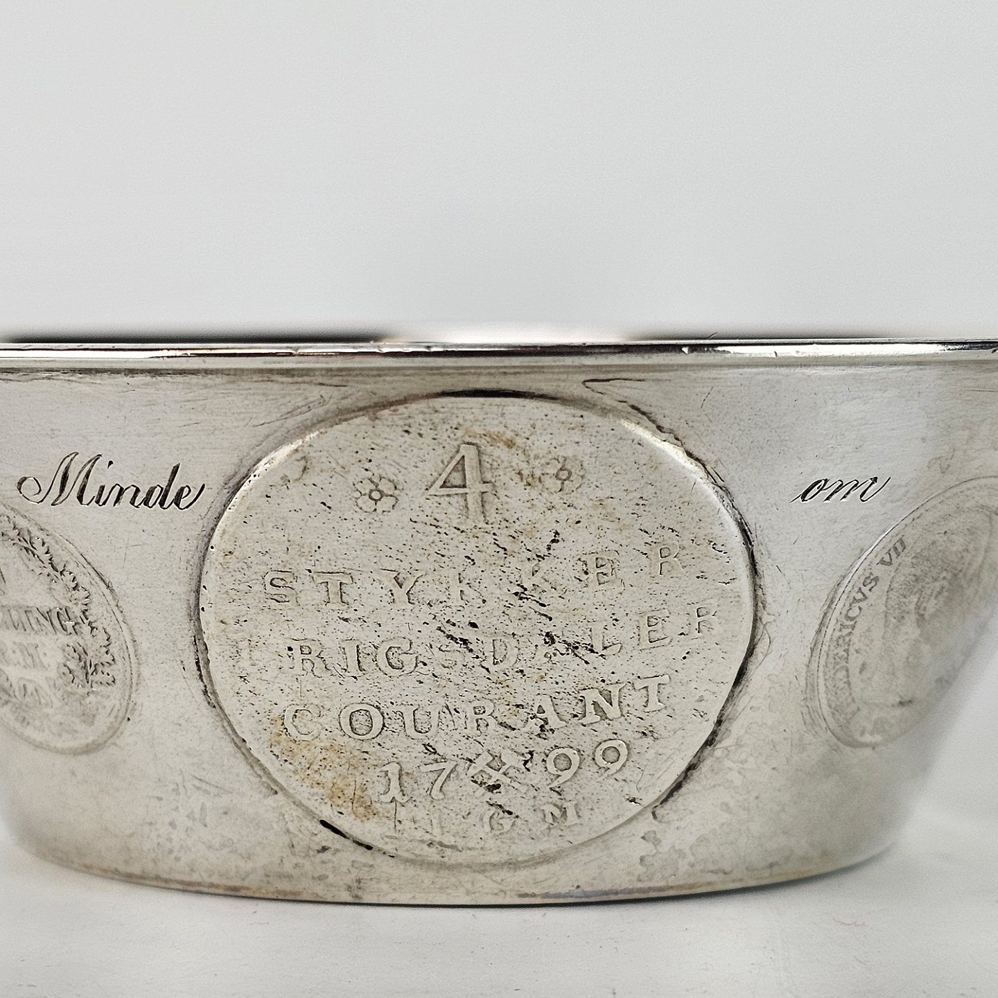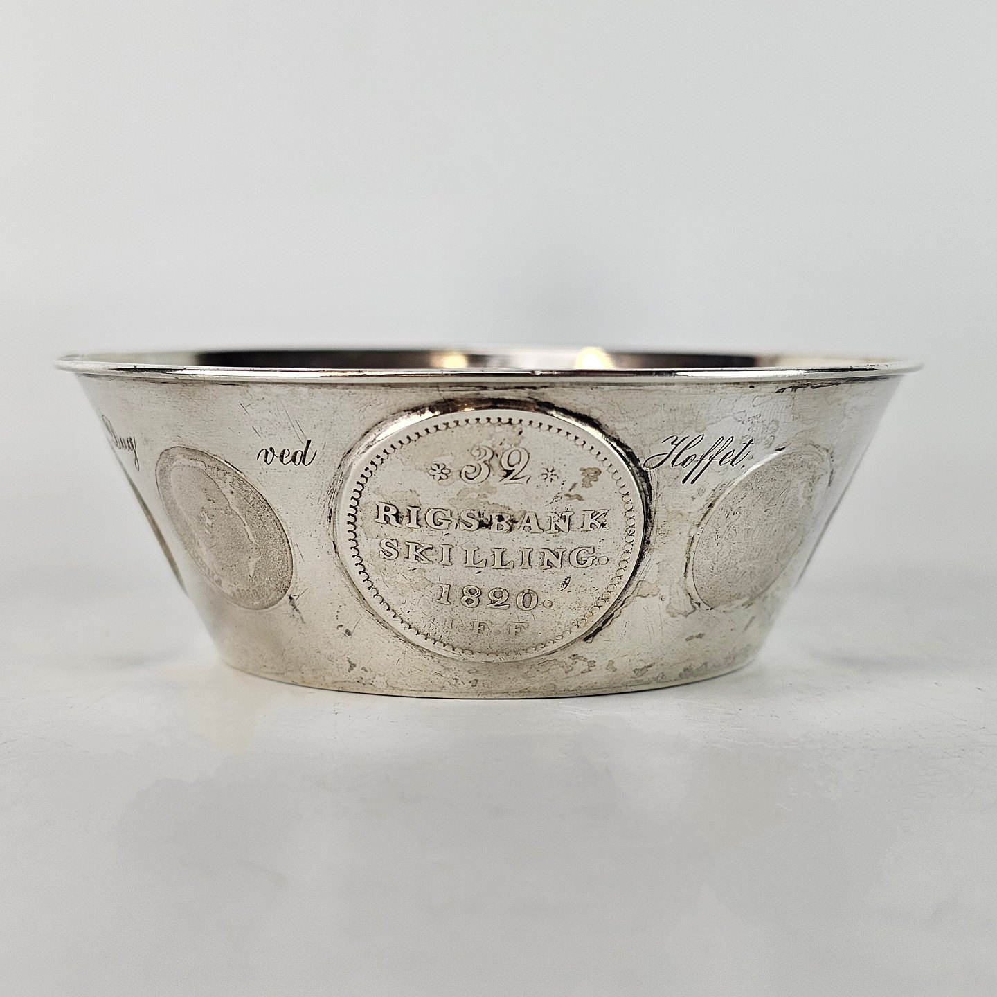 Beskrivelse: Bæger af sølv med otte gamle indsatte mønter.