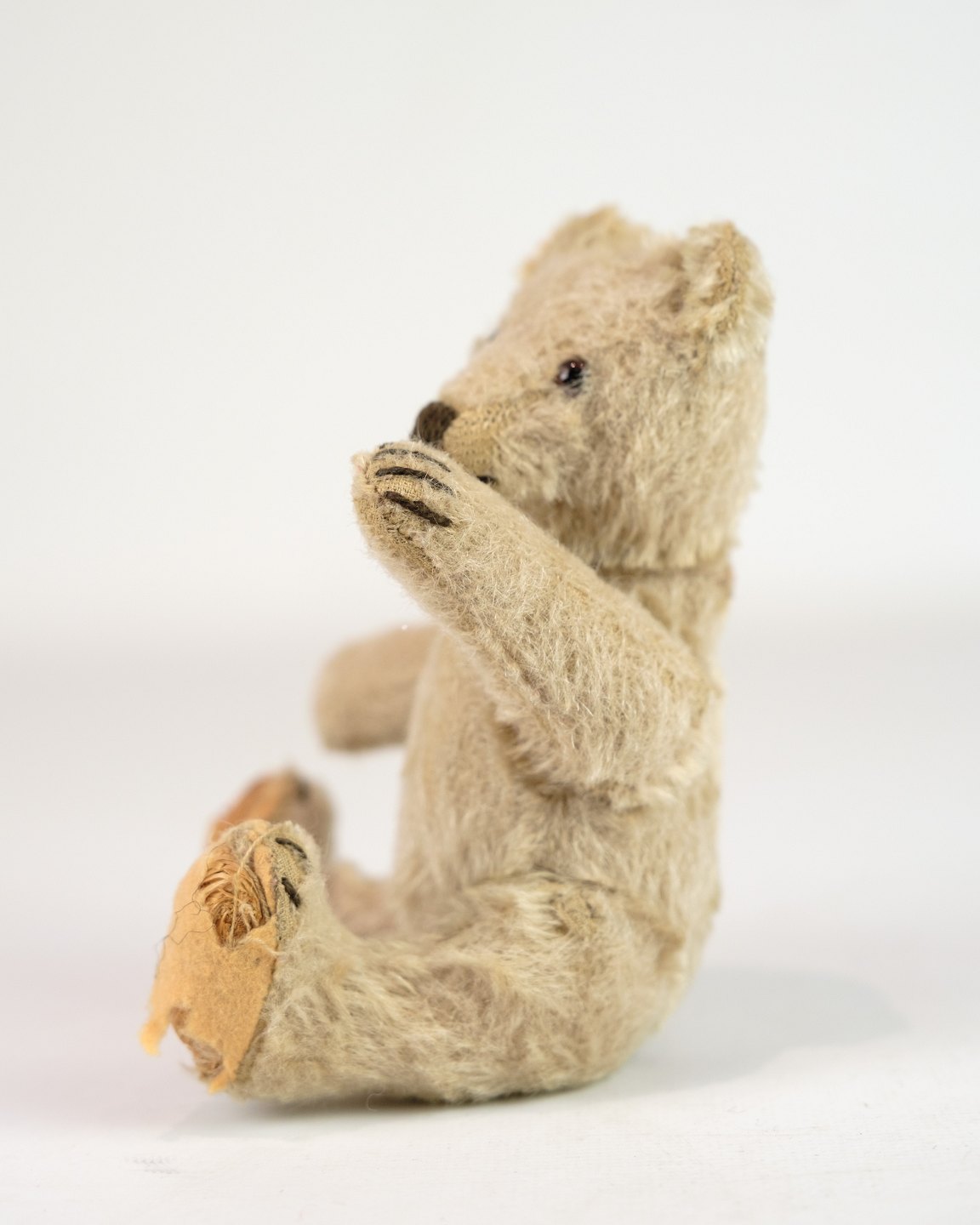 Description: Old teddy bear in beige mohair. The teddy bear has black glass eyes, an embroidered nose and paws with sewn details. The feet show clear signs of use and patina. A nice little collector's teddy bear with an authentic expression.
