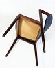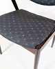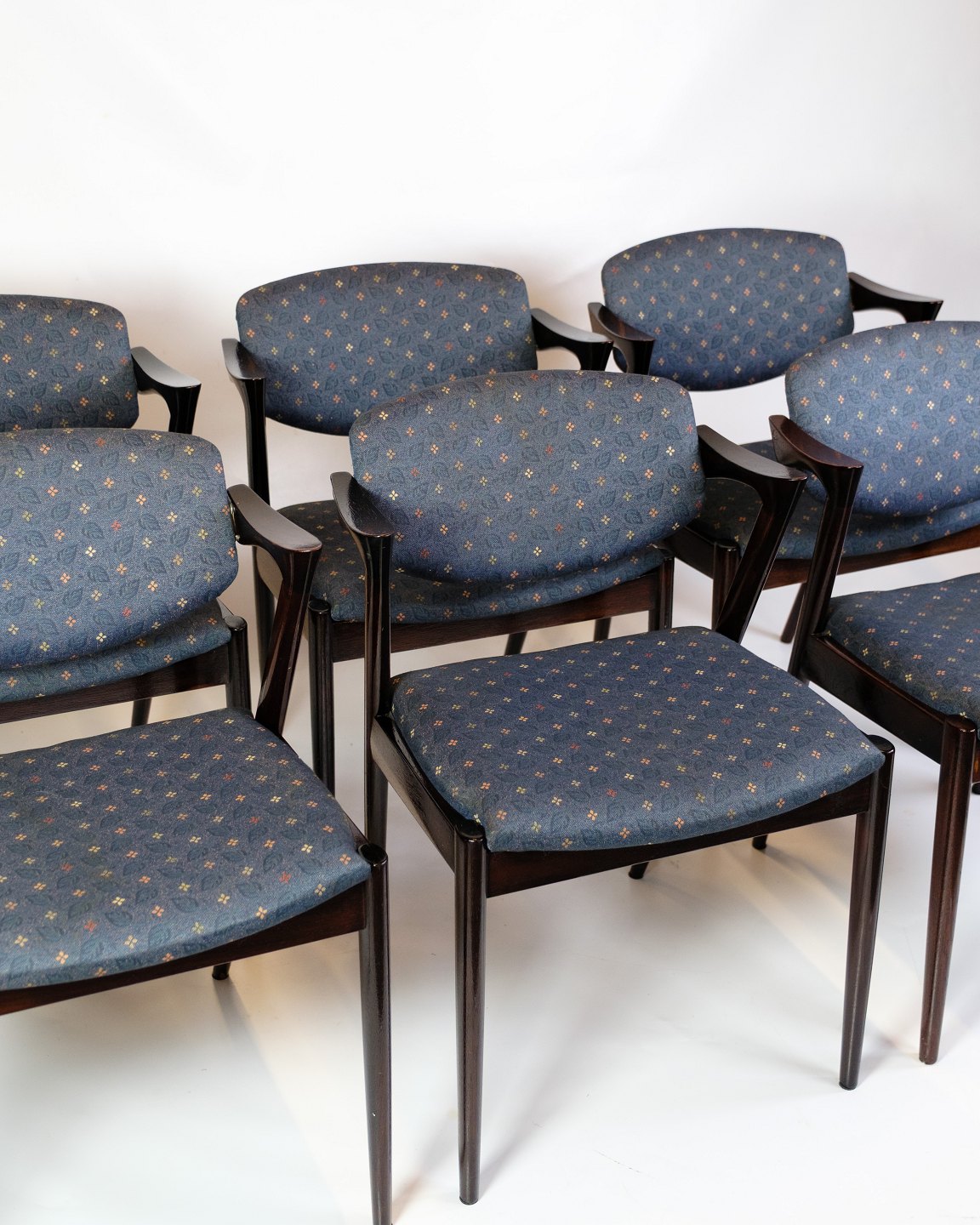Beskrivelse: Sæt af seks spisebordsstole, model 42, designet af Kai Kristiansen og fremstillet af Schou Andersen i 1960’erne. Stolene er lavet i mørkt træ og betrukket med blomstret stof. Model 42 er kendt for sit elegante formsprog og den vipbare ryg, som giver en særlig høj siddekomfort – et af de mest populære designs fra dansk møbelkunst i midten af det 20. århundrede.
