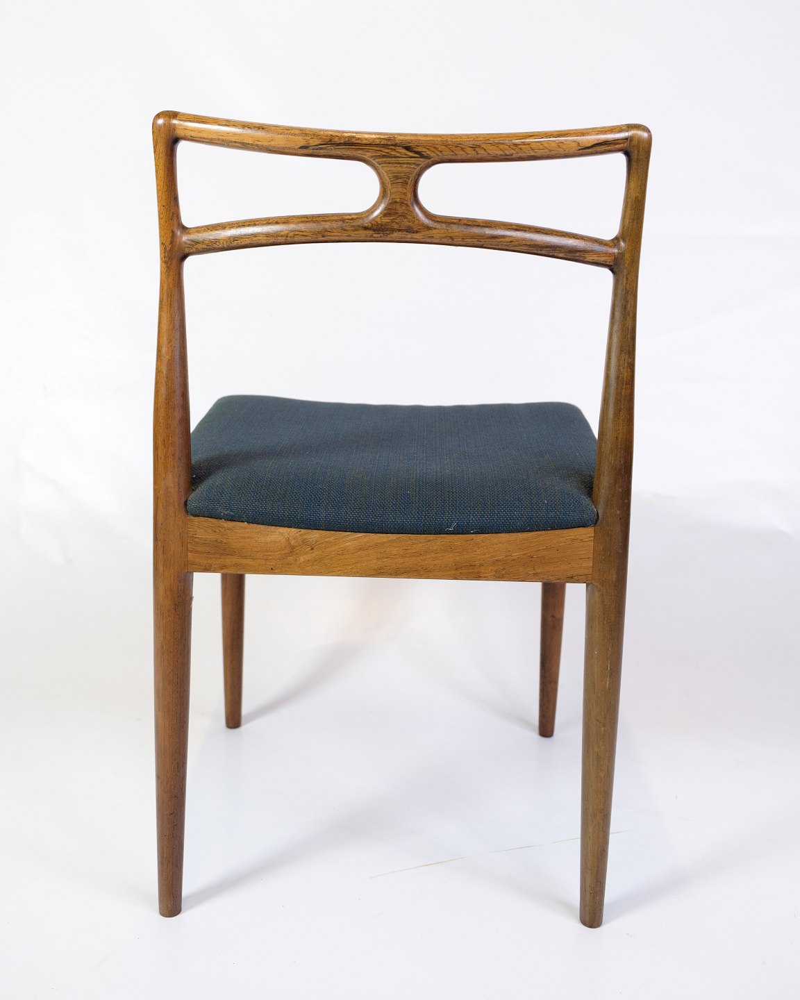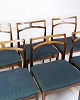Beskrivelse: Sæt af seks spisestuestole, model 94, designet af Johannes Andersen og produceret af Christian Linneberg Møbelfabrik i 1960’erne. Stolene er udført i palisander med sæder i blåt stof.