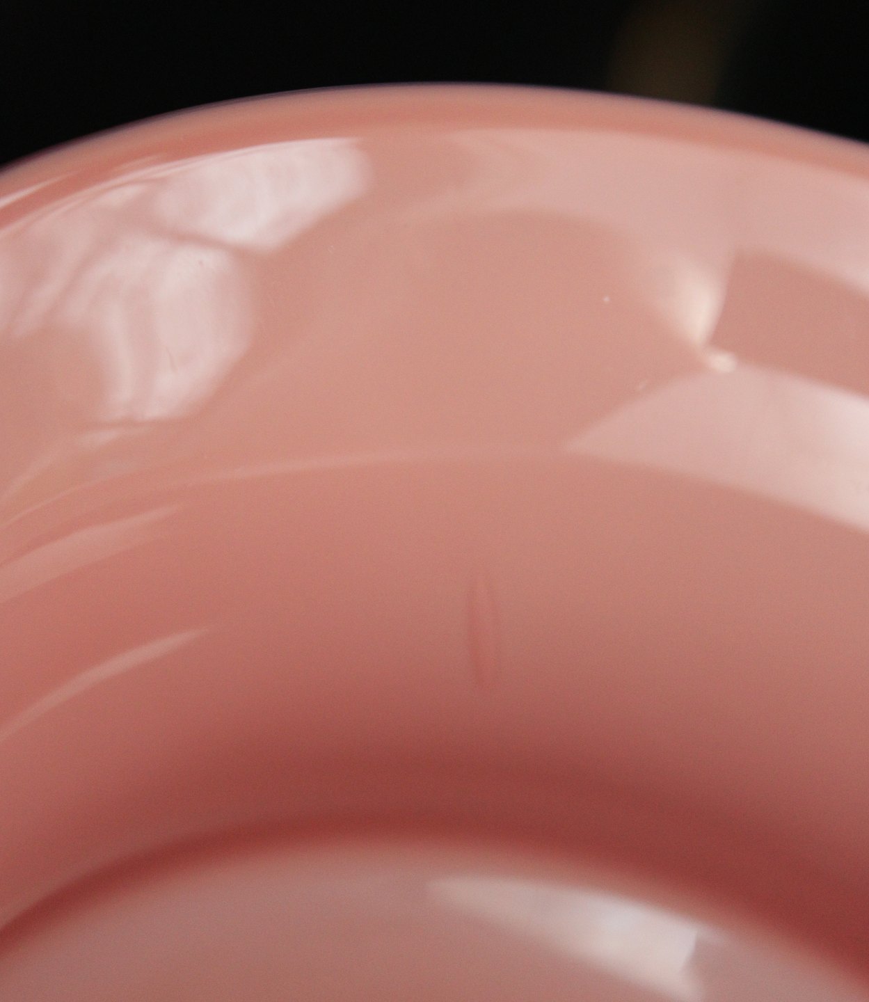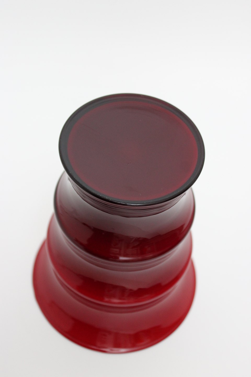 Beskrivelse: Holmegaard, Karen Blixen rød vase, støvet rosa indvendig. Designet af Anja Kjær fra 2000. Ikke signeret. Vasens form er inspireret af afrikanske kvinders hals og armringe. II. sortering, produktionsfejl indvendig i vasen. Højde 17 cm. Diameter 14 cm. Pris: SOLGT